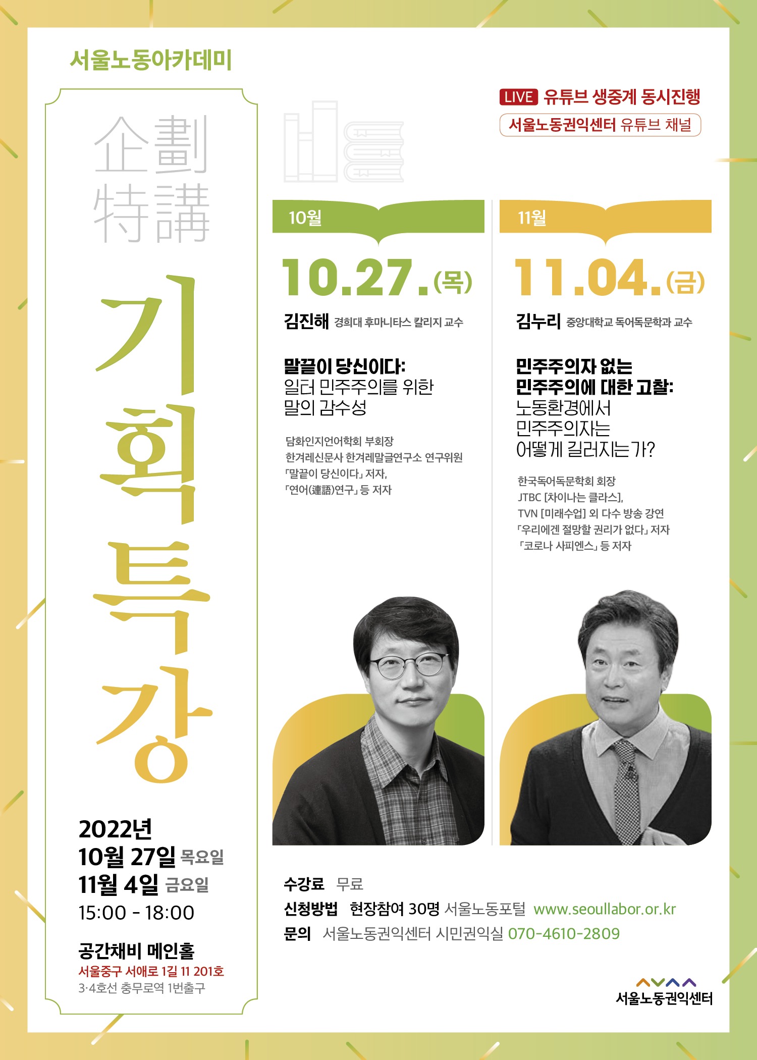 서울노동아카데미 기획 강좌로 10월, 11월 두 번의 특강이 진행됩니다. 【신청안내】 ▶ 10월 특강 : 10. 27. (목) (15:00~18:00) 김진해 (경희대 후마니타스칼리지 교수) ▶ 11월 특강 : 11. 04. (금) (15:00~18:00) 김누리 (중앙대 독어독문학과 교수) ○ 신청 기간 : ~ 10. 26.(수)/ ~11. 03.(목) ○ 신청 방법 : 서울노동포털 (클릭▶)<기획교육 < 교육신청 < 노동교육 - 서울노동포털 (seoullabor.or.kr)> ○ 장소 : `공간채비` 메인홀(서울시 중구 서애로 1길 11 201호) ○ 교육대상 : 본 주제에 관심있는 사람 누구나 ○ 수강료 : 무료 ○ 문의 : 서울노동권익센터 시민권익실 ☏ 070-4610-2809