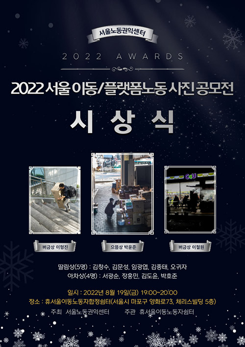 | 행사 2022-08-09 2022 서울 이동/플랫폼노동 사진 공모전 시상식 / 8월 19일(금) 19:00 |