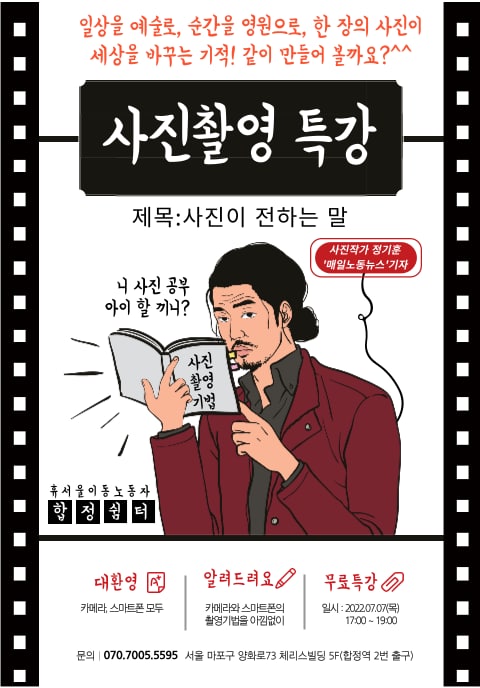 이동노동자를 대상으로 사진 특강이 개최됩니다.이동노동자면 누구나 무료로 참여해서 즐길 수 있는 사진 특강!많은 참여 바랍니다.
