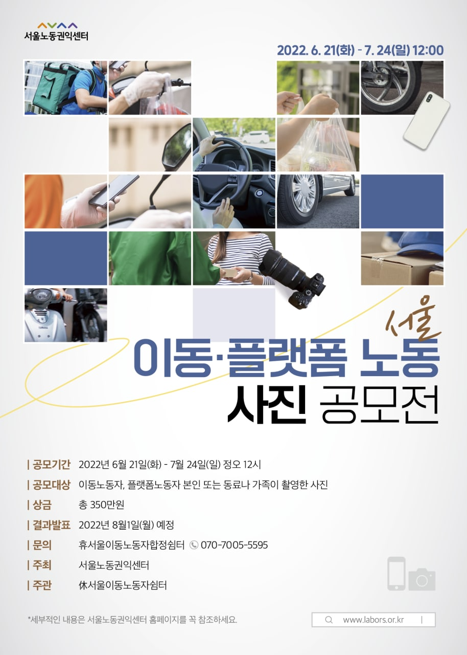 1. 공모내용 ⚪ 주제: 이동노동, 플랫폼 노동을 담다 - 이동노동, 플랫폼 노동의 현장 - 이동노동, 플랫폼 노동을 바라보는 시선 - 이동노동, 플랫폼 노동의 도구(핸드폰, 오토바이, 튼튼한 두 다리, 노트북, 자전거 등) - 이동노동, 플랫폼 노동을 존중하는 이미지 - 이동노동, 플랫폼 노동의 희노애락 - 이동노동, 플랫폼 노동의 모든 것 ⚪ 공모자격: 이동노동자, 플랫폼노동자 본인 또는 동료나 가족이 촬영한 사진 ⚪ 공모기간: 2022. 06. 21 – 07. 24. ⚪ 주최: 서울노동권익센터 ⚪ 주관: 휴서울이동노동자쉼터
