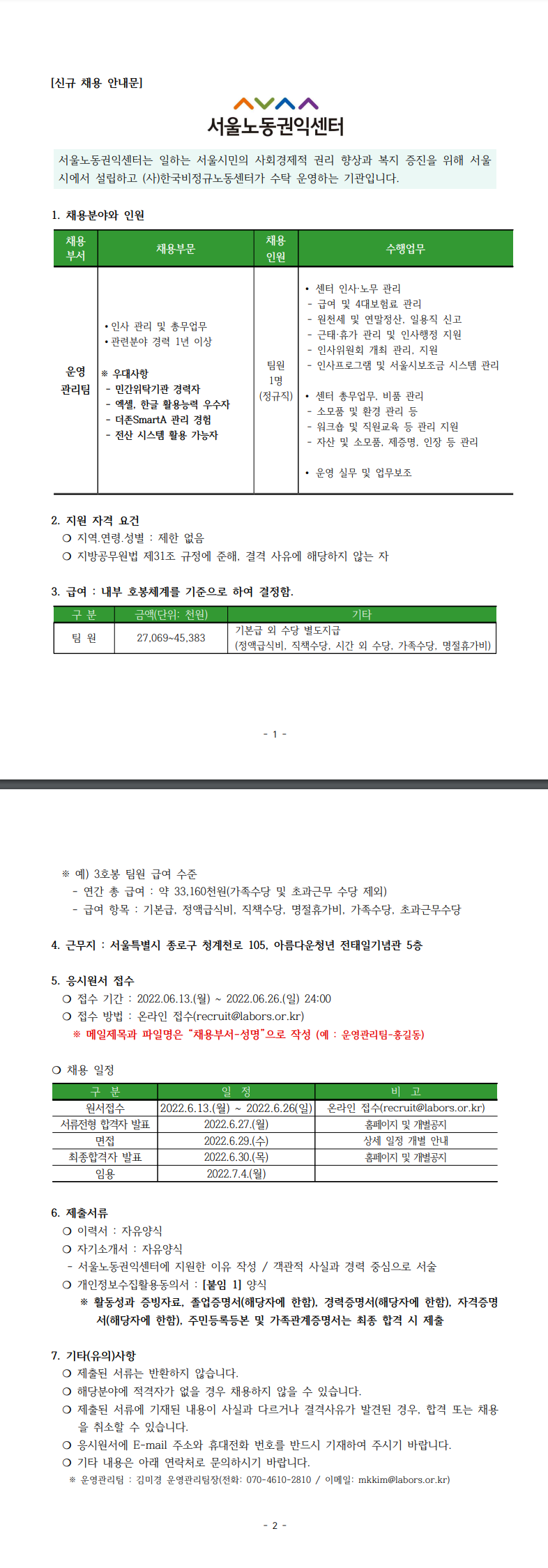 서울노동권익센터 운영관리팀 인사담당자 채용(6차)