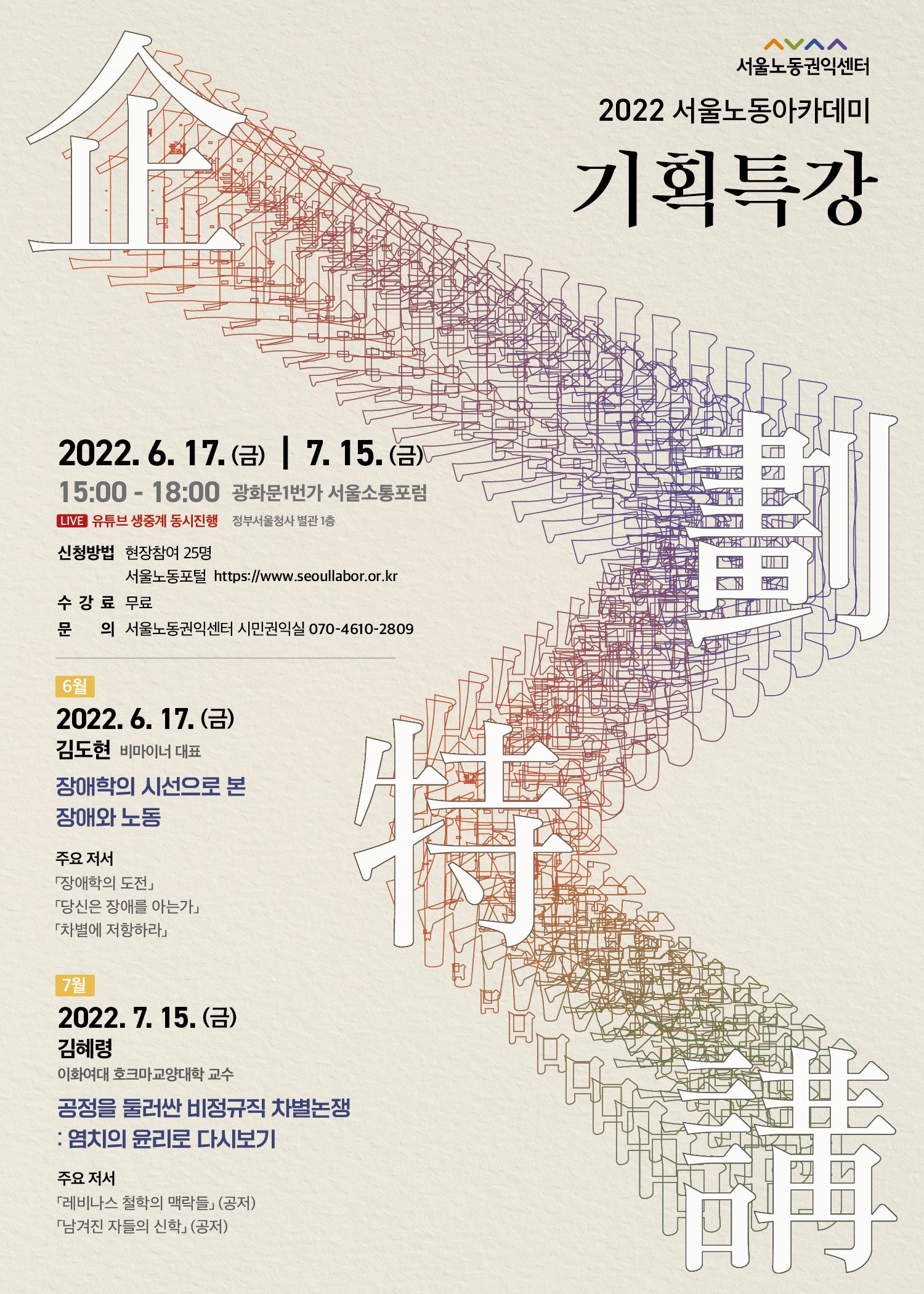 서울노동아카데미 기획 강좌로 6월, 7월 두 번의 특강이 진행됩니다. 【신청안내】 ▶ 6월 특강 : 6. 17. (금) (15:00~18:00) 김도현 (비마이너 대표, 작가) ▶ 7월 특강 : 7. 15. (금) (15:00~18:00) 김혜령 (이화여자대학교 호크마교양대학 교수) ○ 신청 기간 : 5. 20.(금) ~ 6. 16.(목) ○ 신청 방법 : 서울노동포털 (클릭▶)<기획교육 < 교육신청 < 노동교육 - 서울노동포털 (seoullabor.or.kr)> ○ 장소 : 광화문1번가 서울소통포럼(서울시 종로구 사직로 8길 60, 정부서울청사 별관 1층) ○ 교육대상 : 본 주제에 관심있는 사람 누구나, 시민단체 활동가 ○ 수강료 : 무료 ○ 문의 : 서울노동권익센터 시민권익실 ☏ 070-4610-2809