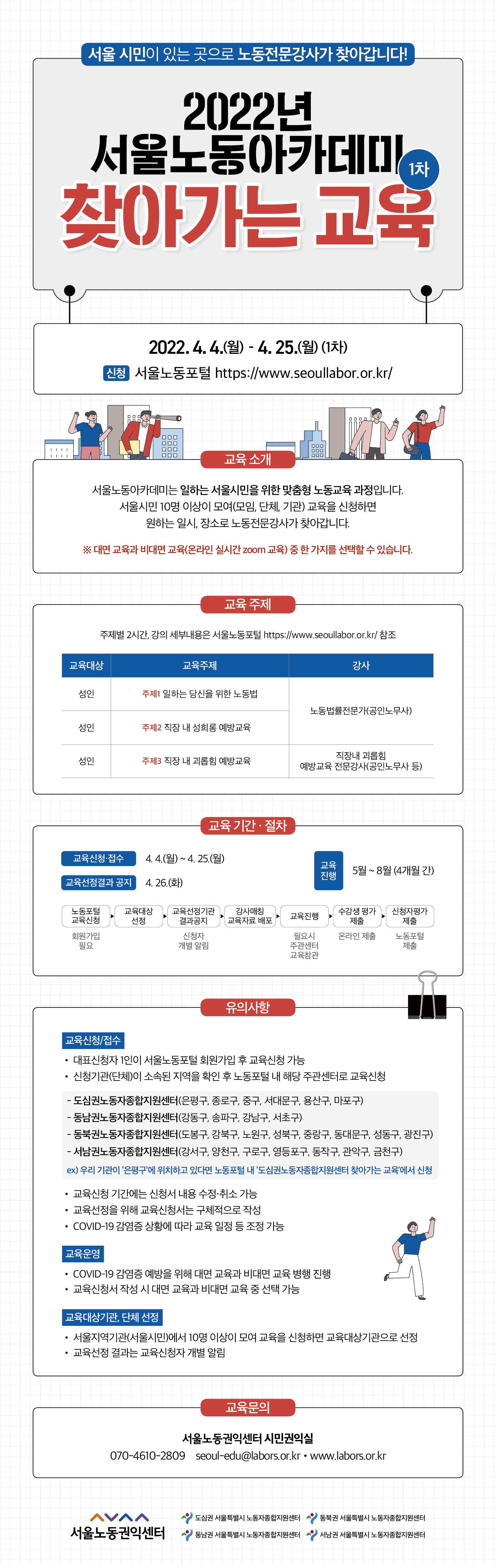 서울노동아카데미 `찾아가는 교육` 1차 신청 안내서울노동아카데미는 일하는 서울시민을 위한 맞춤형 노동교육 과정입니다.10명 이상이 모여(단체, 기관) 교육을 신청하면 원하는 일시, 장소로 노동전문강사가 찾아갑니다.※ 대면 교육 or 비대면 교육 선택 가능