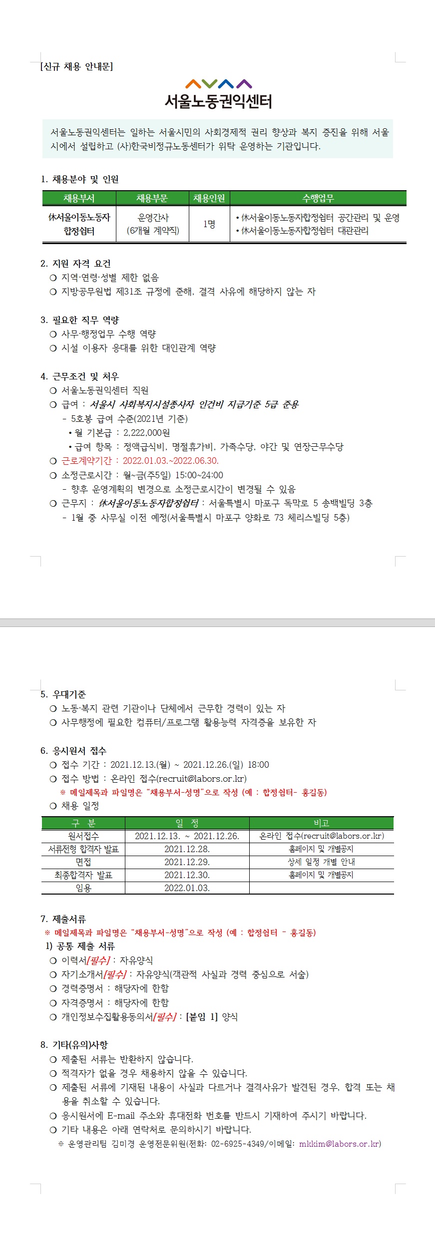 휴서울이동노동자합정쉼터 채용공고(12/13~12/26)