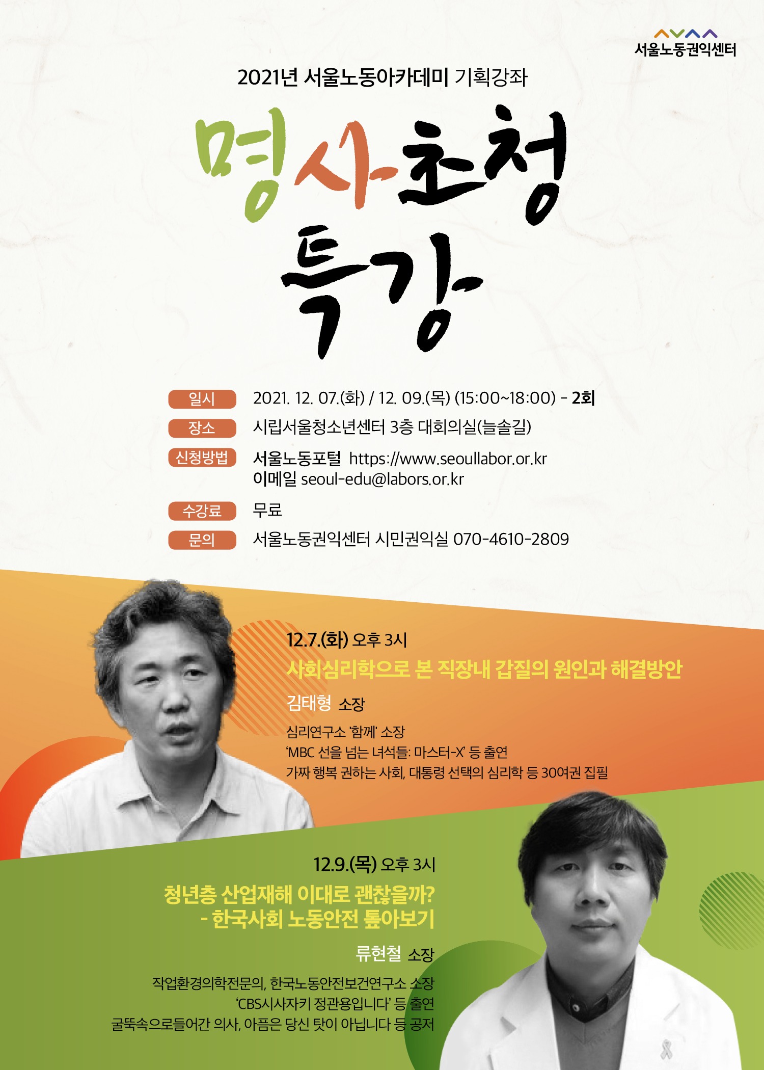【일정안내】 ▶특강 1 : 12. 7. (화) (15:00~18:00) 김태형 (심리학자, 심리연구소 `함께` 소장) ▶특강 2 : 12. 9. (목) (15:00~18:00) 류현철 (직업환경의학전문의, 한국노동안전보건연구소 소장) - 신청 기간: 11. 10.(수) ~ 12. 3.(금) - 신청방법: 서울노동포털 <기획교육 < 교육신청 < 노동교육 - 서울노동포털 (seoullabor.or.kr)> 이메일 <seoul-edu@labors.or.kr>_참여특강, 성명, 소속, 연락처 기재 - 서울노동권익센터 시민권익실 ☏ 070-4610-2809