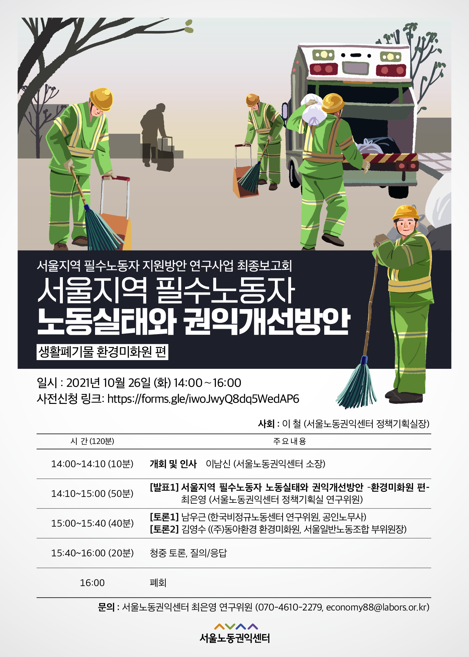 [서울지역 필수노동자 지원방안 연구사업 최종보고회]서울지역 필수노동자 노동실태와 권익개선방안-생활폐기물 환경미화원 편일시: 2021년 10월 26일(화) 14:00~16:00사전신청 링크: https://forms.gle/iwoJwyQ8dq5WedAP6