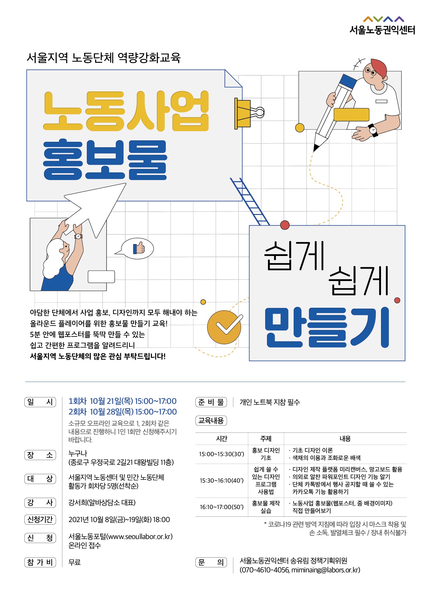 | 행사 2021-10-08 서울지역 노동단체 역량강화교육 `노동사업 홍보물 쉽게쉽게 만들기` 안내(신청 마감) |