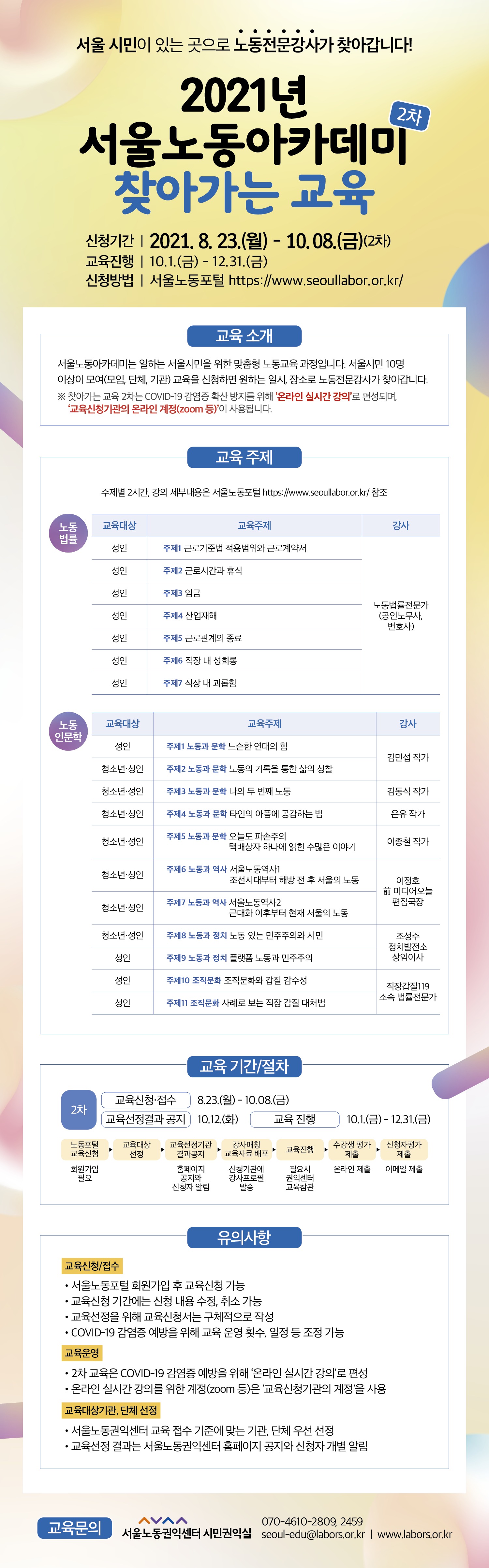※ 서울노동아카데미 찾아가는 교육 2차 교육 신청/접수 기간이 연장되었음을 안내드립니다. 위에 게시 된 `주제별 강의계획서`와 `교육신청 방법 안내문`을 다운로드 받으세요. ※ 교육신청바로가기 찾아가는교육 < 노동교육 - 서울노동포털 (seoullabor.or.kr) (2021년 10월 08일(금) 18:00까지 신청 가능합니다)