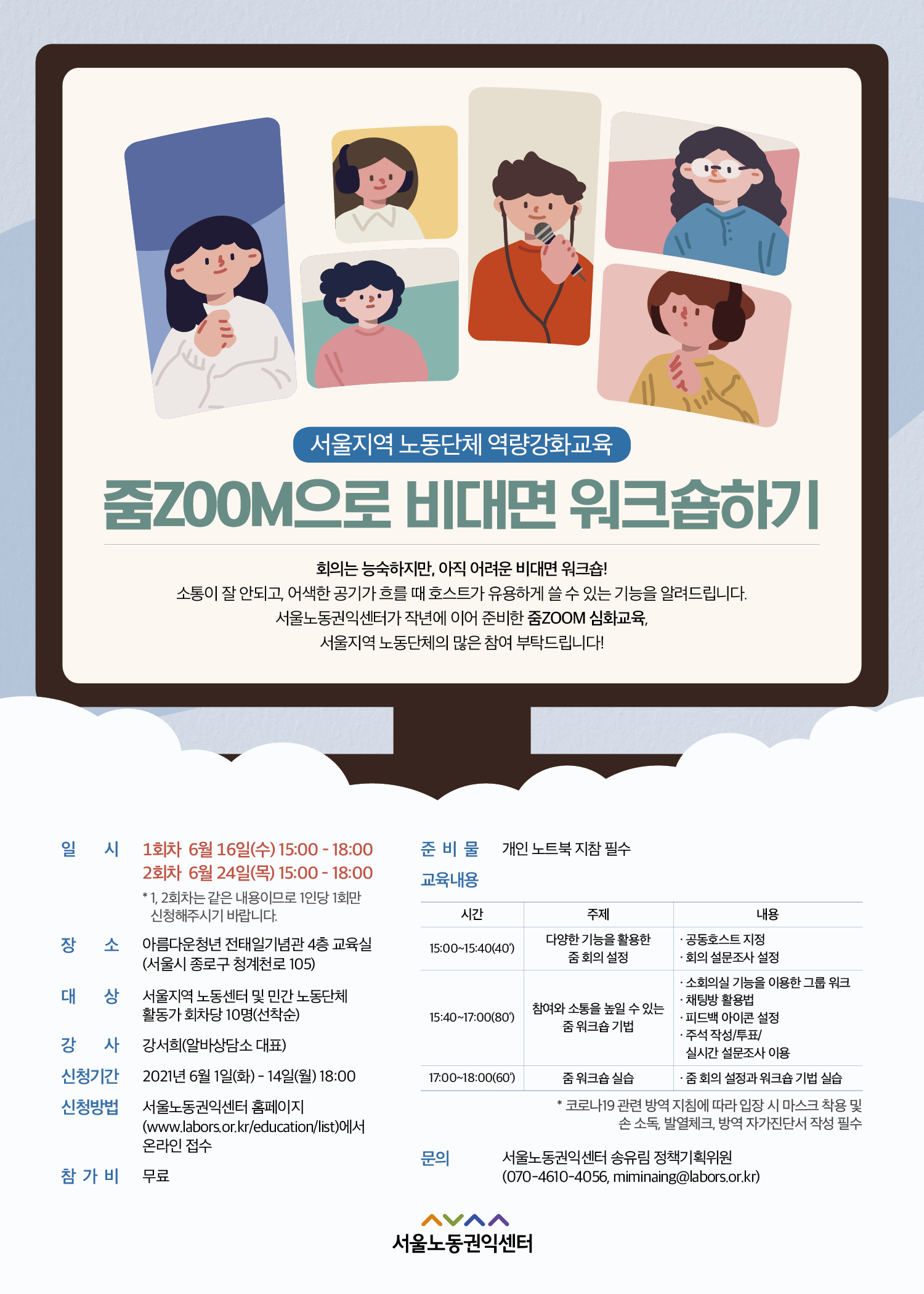 | 행사 2021-06-01 서울지역 노동단체 역량강화교육 `줌zoom으로 비대면 워크숍 하기` 안내(1회차 신청: ~6/14 / 2회차 마감) |