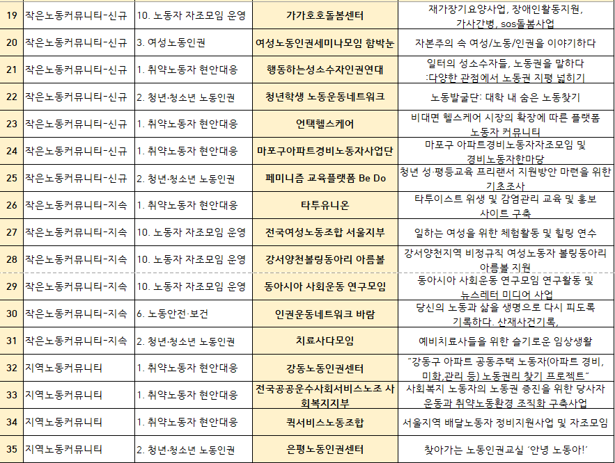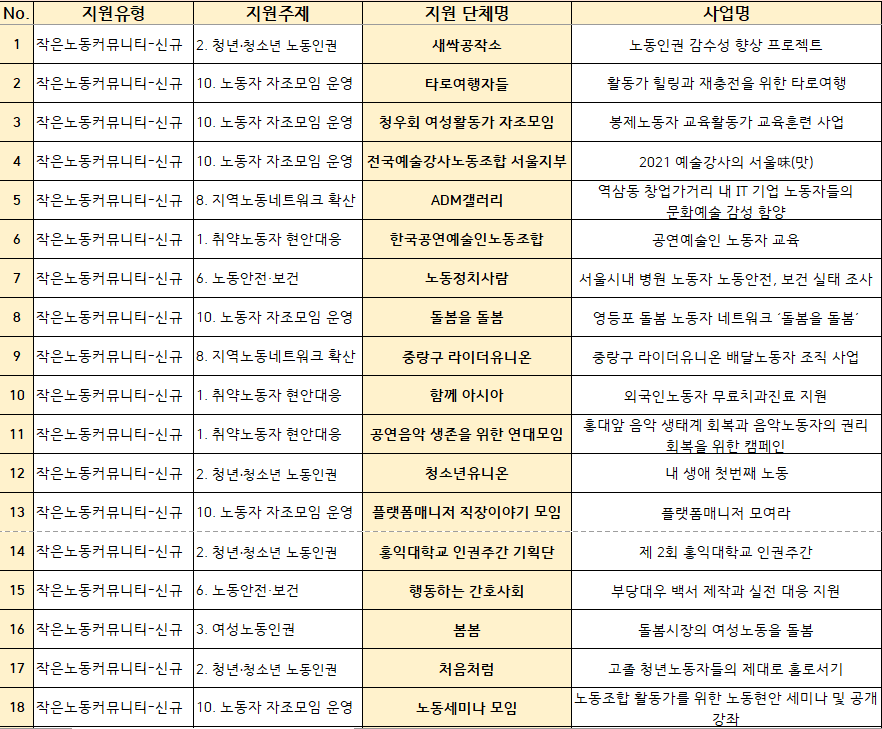 [ 2021년 노동커뮤니티 지원사업 접수현황] 2021년 서울노동권익센터 노동커뮤니티 지원사업에 관심 가져주셔서 감사합니다. 3월 22일(월) 18시까지 아래와 같은 단체와 사업이 접수되었음을 알려드립니다. 혹시 신청하였으나 접수현황에 누락되었거나 신청내용과 다르게 접수되었다면, 서울노동권익센터 정책기획실 송유림(070-4610-4056)에게 문의해주시기 바랍니다. 접수된 단체에 대한 심사 및 선정은 아래와 같이 진행됩니다. – 사전심사 : 3월 23일(화) - 서류심사 : 3월 24일(수) 14:00~18:00 - 서류심사 결과공지 : 3월 25일(목) / 서울노동권익센터 홈페이지 – 면접심사 : 3월 26일(금) (세부일정 개별 통보) 13:00~17:00 – 최종발표 : 3월 29일(월) / 서울노동권익센터 홈페이지 * 상기 모든 일정은 변경될 수 있습니다. * 아래 목록은 유형별 지원순서대로 작성되었습니다.
