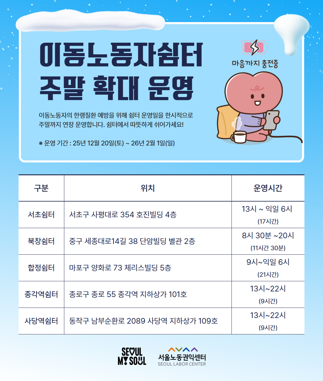 이동노동자의 한랭질환 예방을 위해 쉼터 운영일을 한시적으로 주말까지 확대해 운영합니다.