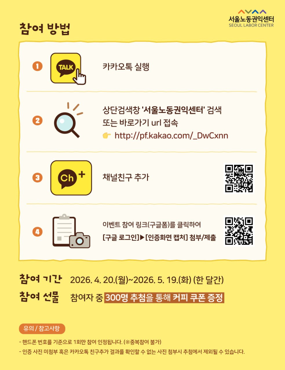 카카오톡채널 친구 추가 이벤트5서울노동권익센터 카카오톡채널 친구추가하고,일하는 서울시민에게 꼭 필요한 노동소식을 쉽게 받아보세요.