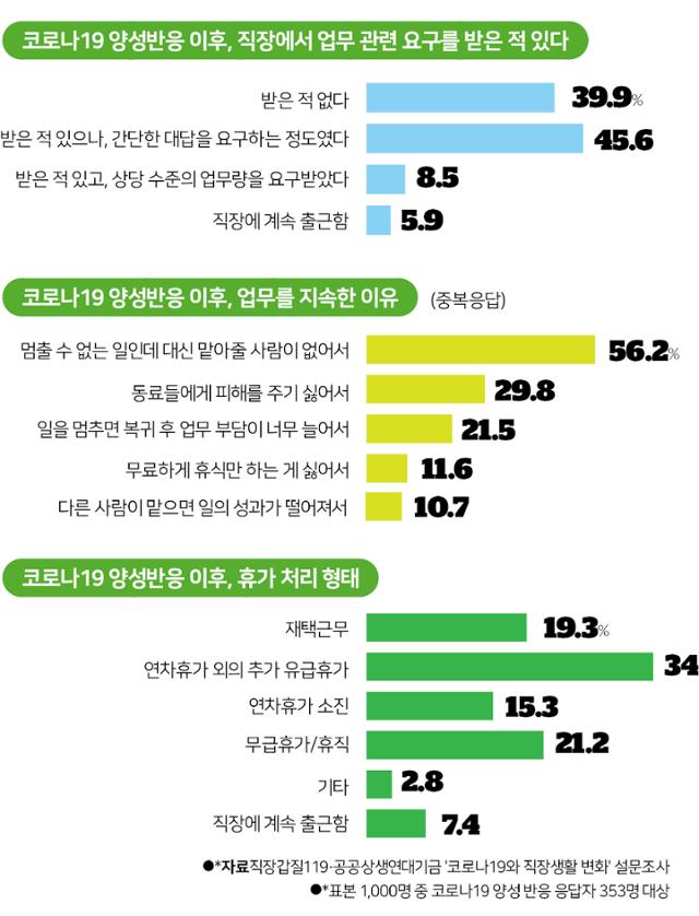 '코로나19에 걸리고도 일할 것을 요구받는다'는 직장인이 상당수다. 직장갑질119와 공공상생연대기금이 지난 6월 1,000명의 직장인을 대상으로 진행한 '코로나19와 직장생활 변화' 설문조사에서 코로나19에 감염됐던 응답자 중 '업무 관련 요구를 받은 적 있다'고 답한 비율은 54.1%나 됐다. 8.5%는 '상당 수준의 업무량을 요구받았다'고 했다.