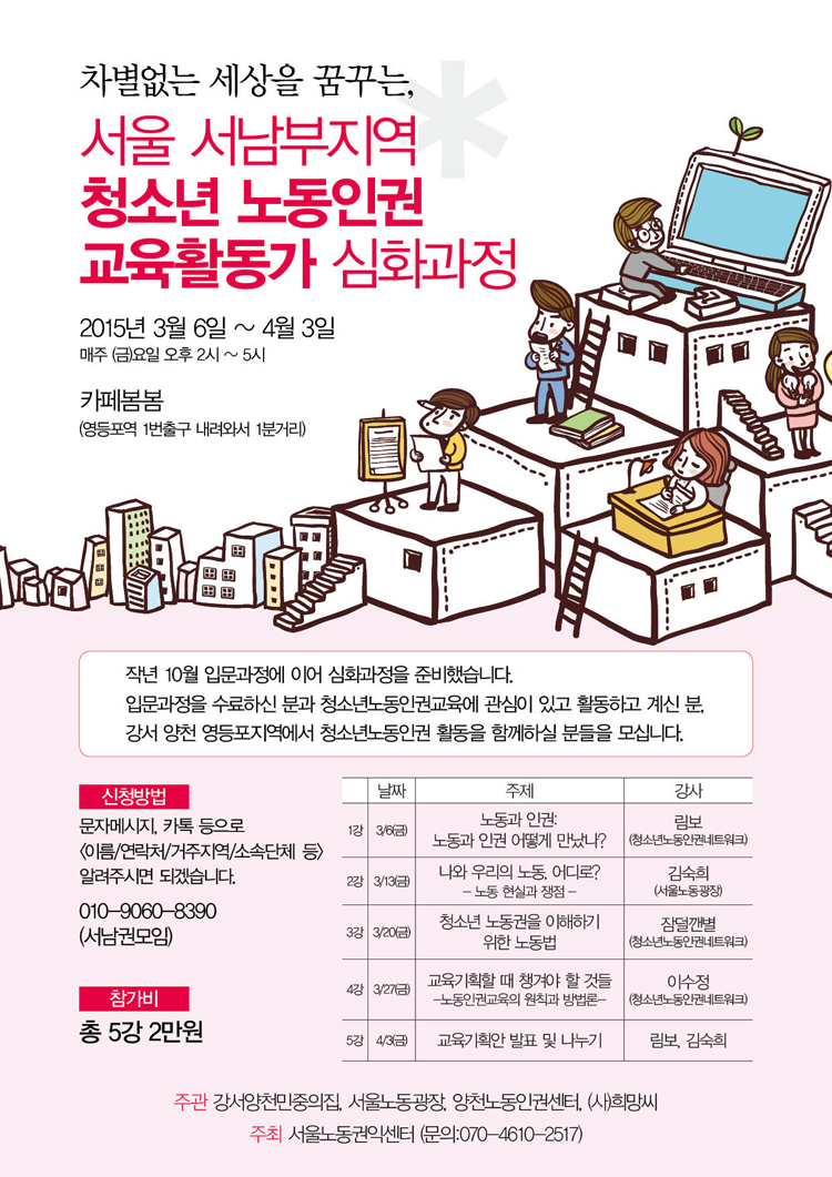 기간 : 3월6일부터 4월3일까지 매주 금요일 (총 5주) 오후2~5시장소 : 카페봄봄 (영등포역 1번출구)문의 : 서울노동권익센터 (직통 070-4610-2517)혹은 서남권 모임으로 연락주세요.