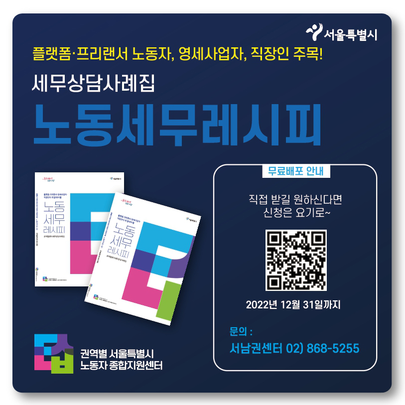 서울시 4개 권역(도심, 동남, 동북, 서남) 노동자 종합지원센터에서 세무상담사례집 「노동세무레시피」를 발간했습니다. 2021년부터 현재까지 진행한 세무상담 사례와 세무신고 Tip, 프리랜서 표준계약서 양식 등 플랫폼·프리랜서 노동자에게 필요한 내용들을 담았어요. PART 01 - 서울시 권역별 센터 소개와 세무상담 사업 성과 PART 02 - 특수고용노동자, 플랫폼·프리랜서 노동자, 직장인, 외국인노동자 상담 사례와 참조자료 (PLUS TIP) PART 03 - 상담사례를 이해하는데 도움을 드리기 위한 세무용어 설명을 수록했습니다. 노동세무레시피를 받아보시고 싶으신 분들은 동남권 서울시 노동자종합지원센터 02-408-5255 동북권 서울시 노동자종합지원센터 02-2217-5255 서남권 서울시 노동자종합지원센터 02-868-5255 로 연락하시거나 아래 구글폼으로 신청해주세요~