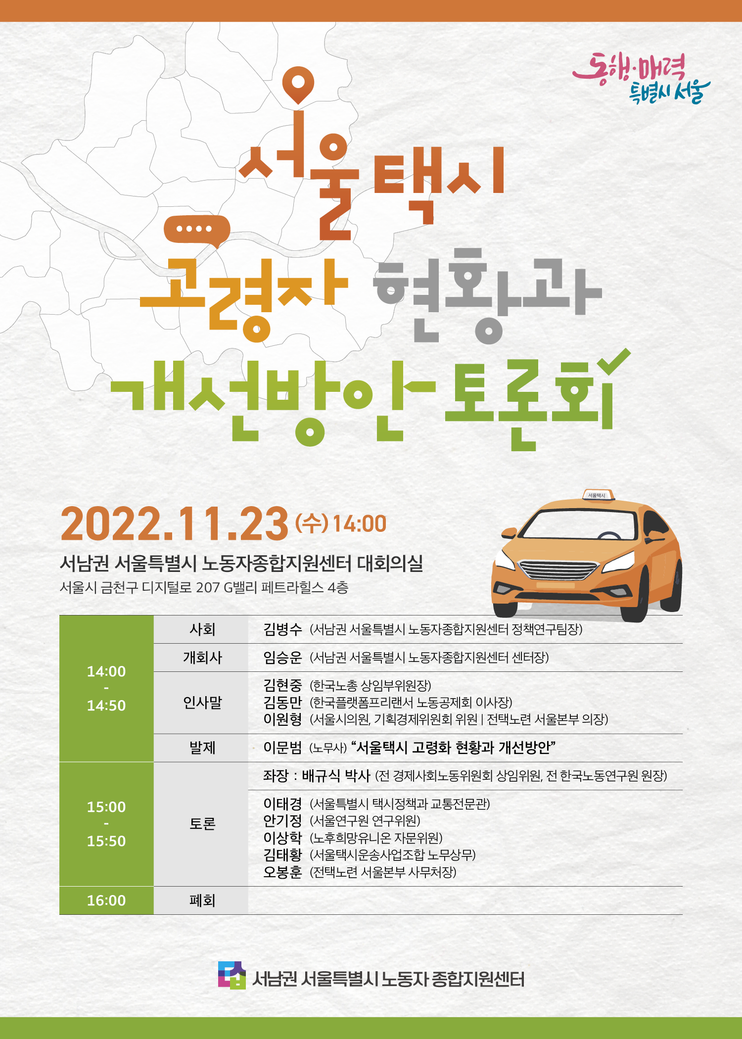 서남권 서울특별시 노동자 종합지원센터 「서울택시 고령자 현황과 개선방안」 토론회를 개최합니다.