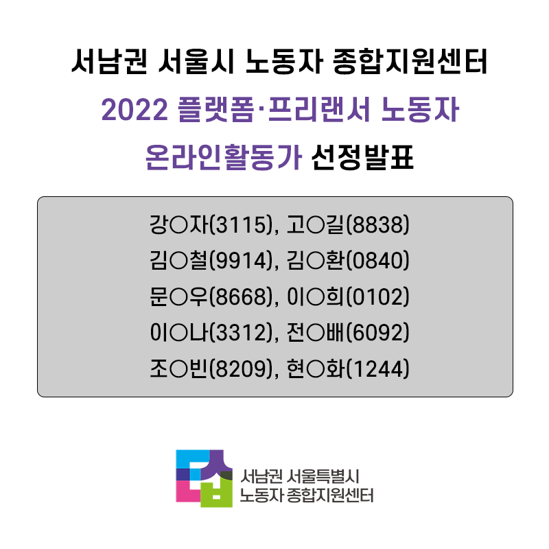 | 공지 서남권 2022 플랫폼·프리랜서 온라인활동가 선정발표 |
