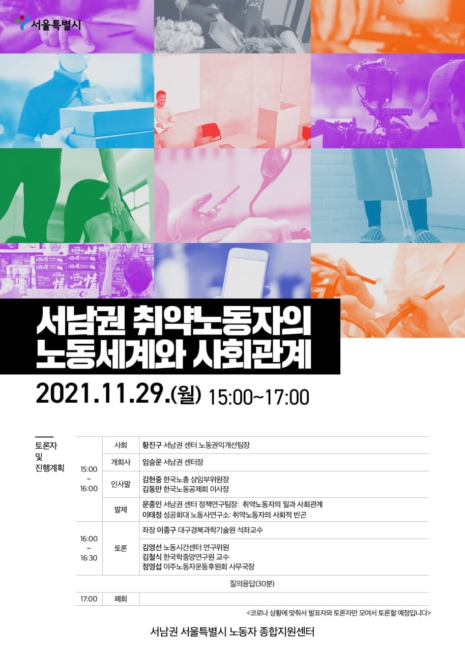 서남권 서울특별시 노동자 종합지원센터에서 「서남권 서남권역 산업노동 실태조사」 토론회를 개최합니다.