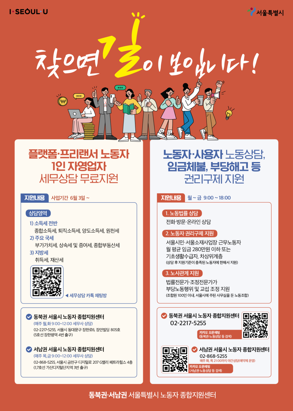 1. 플랫폼 ㆍ 프리렌서 노동자 ㆍ1인 자영업자 세무상담 무료 지원 ■ 지원 내용 ㆍ 소득세 전반 : 종합소득세, 퇴직소득세, 양도소득세, 원천세 ㆍ 주요 국세 : 부가가치세, 상속세 및 증여세, 종합부동산세 ㆍ 지방세 : 취득세, 재산세 2. 노동자 ㆍ 사용자 노동상담, 임금체불 ㆍ 부당해고 등 권리구제 지원 ■ 지원 내용 ㆍ 노동법률상담 : 전화 ㆍ 방문 ㆍ 온라인 상담 ㆍ 노동자 권리구제 지원 : 서울시민 ㆍ 서울소재 사업장 근무 노동자 중 월 평균 임금 280만원 이하 또는 기초생활수급자, 차상위 계층 (상담 후 지원기준이 충족된 노동자에 한해서 지원) ㆍ 노사관계 지원 : 법률전문가 ㆍ 조정전문가가 부당노동행위 및 교섭 조정 지원 (조합원 100인 이내, 서울시에 주된 사무실을 둔 노동조합) ![]() |