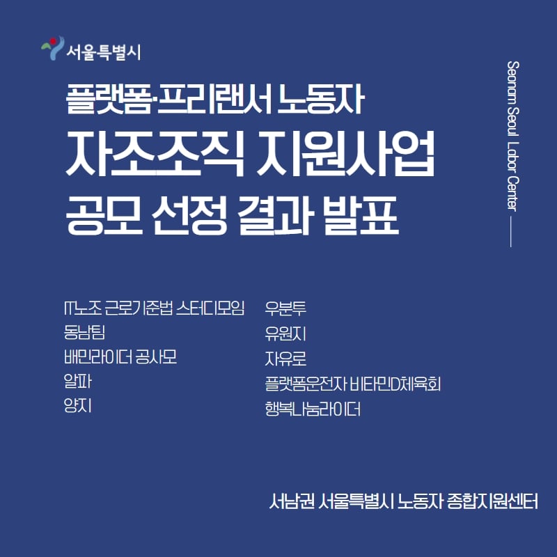 2021년 서울시 플랫폼‧프리랜서 노동자 자조조직 지원사업에 참여해주셔서 고맙습니다. 2021년 자조조직 지원사업 선정 결과를 공고합니다. 많은 조직에서 신청해 주셨으나 모두 함께 하지 못 하는 점 양해 부탁드리오며 결과는 아래와 같습니다.