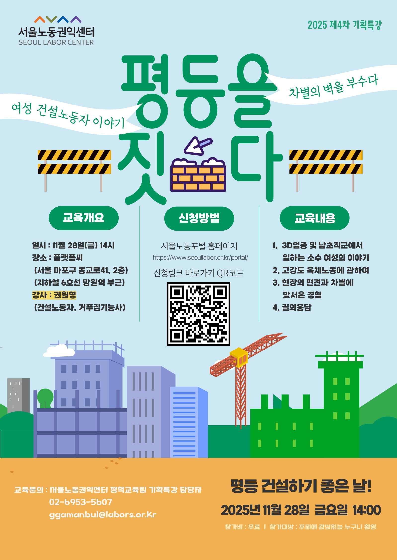 1. 신청기간 : 2025.11.18.(화)~11.28.(금) 2. 교육일시 : 2025.11.28.(금) 14시~16시 3. 신청 : 온라인 신청(클릭) 4. 강사 : 권원영 (건설노동자, 거푸집기능사) 5. 장소 : 플랫폼씨(서울 마포구 동교로41, 2층) - 지하철역 6호선 망원역 부근 6. 주요내용 - 3D업종 및 남초직군에서 일하는 소수 여성의 이야기 - 고강도 육체노동에 관하여 - 현장의 편견과 차별에 맞선 경험 7. 문의 : 정책교육팀 02-6953-5607 / ggamanbul@labors.or.kr |