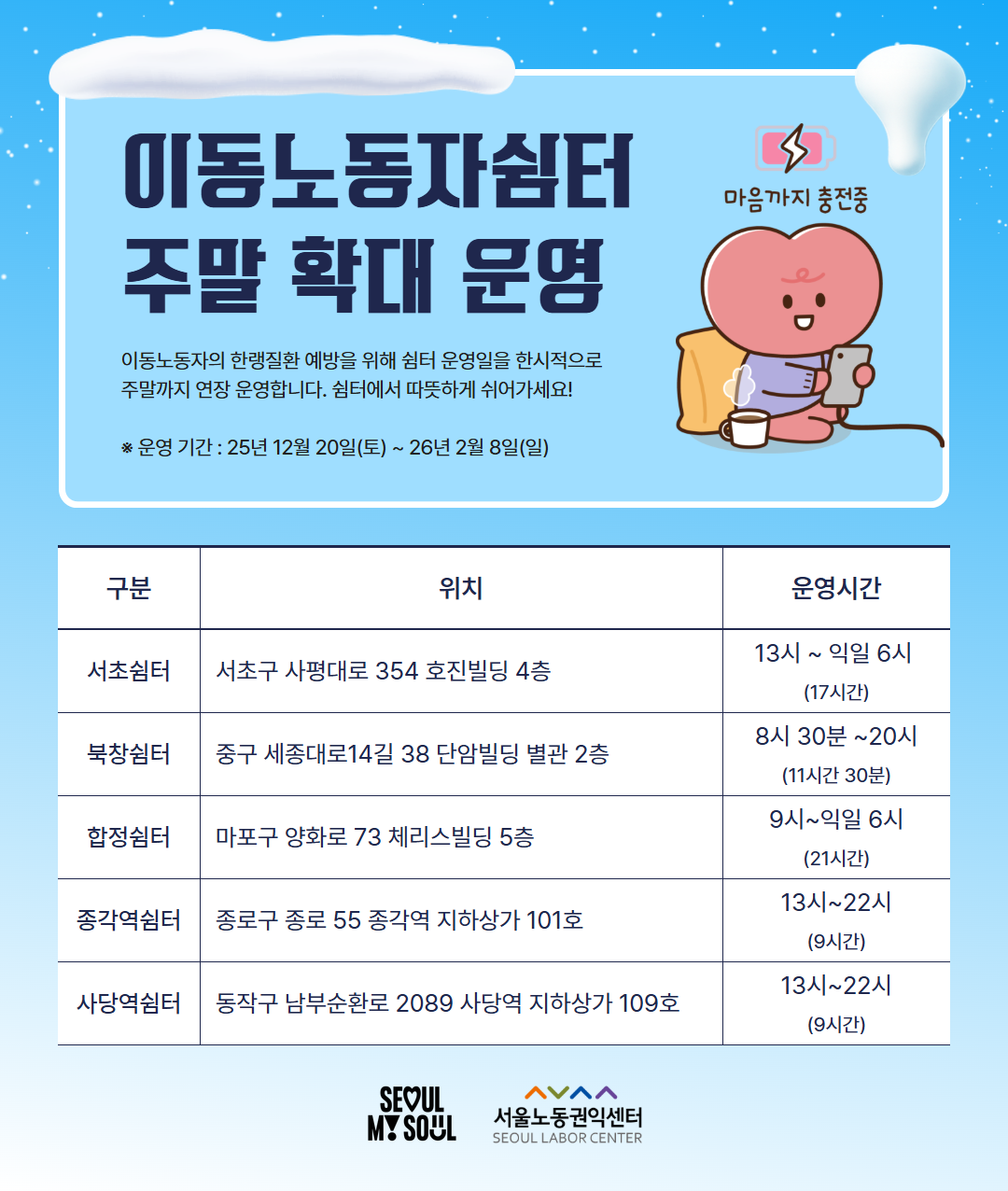 이동노동자쉼터 한시적 주말 확대 운영이동노동자의 한랭질환 예방을 위해 쉼터 운영일을 한시적으로 주말까지 확대해 운영합니다.