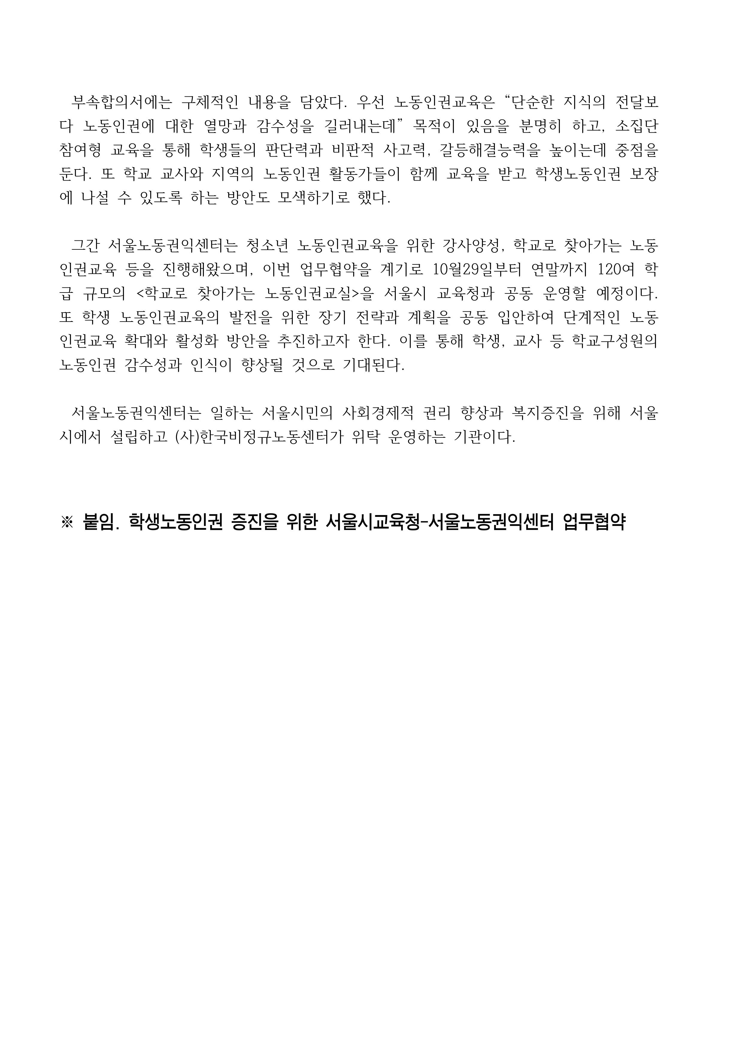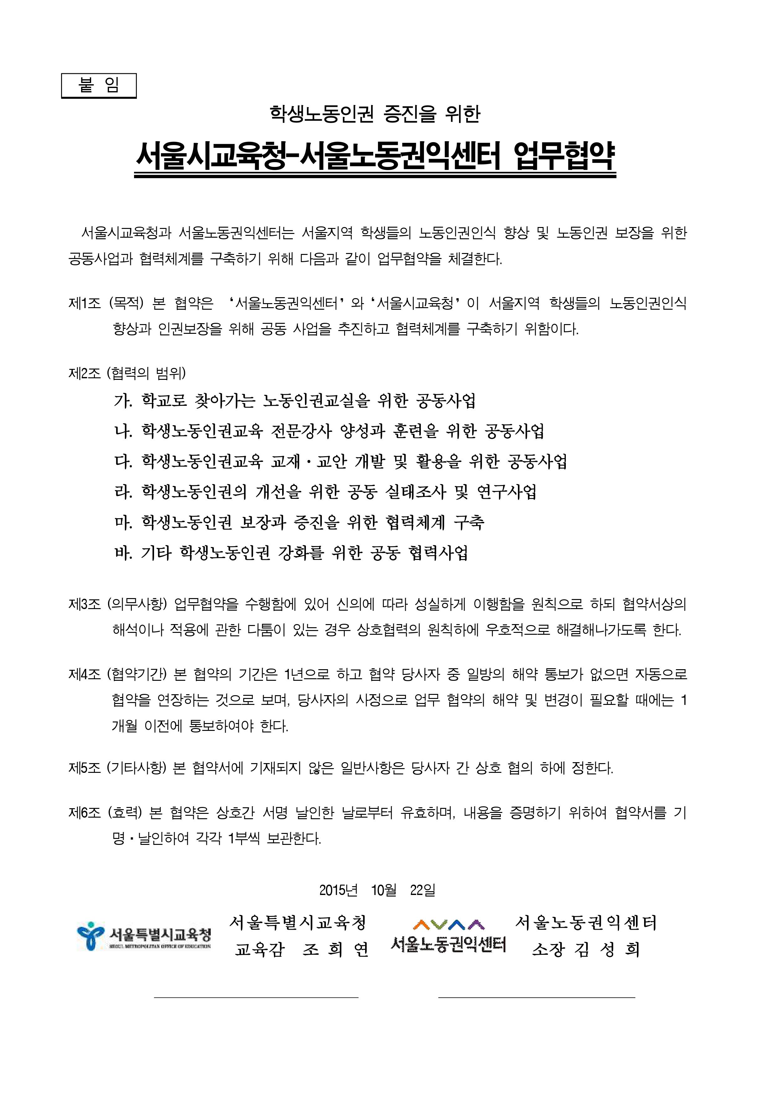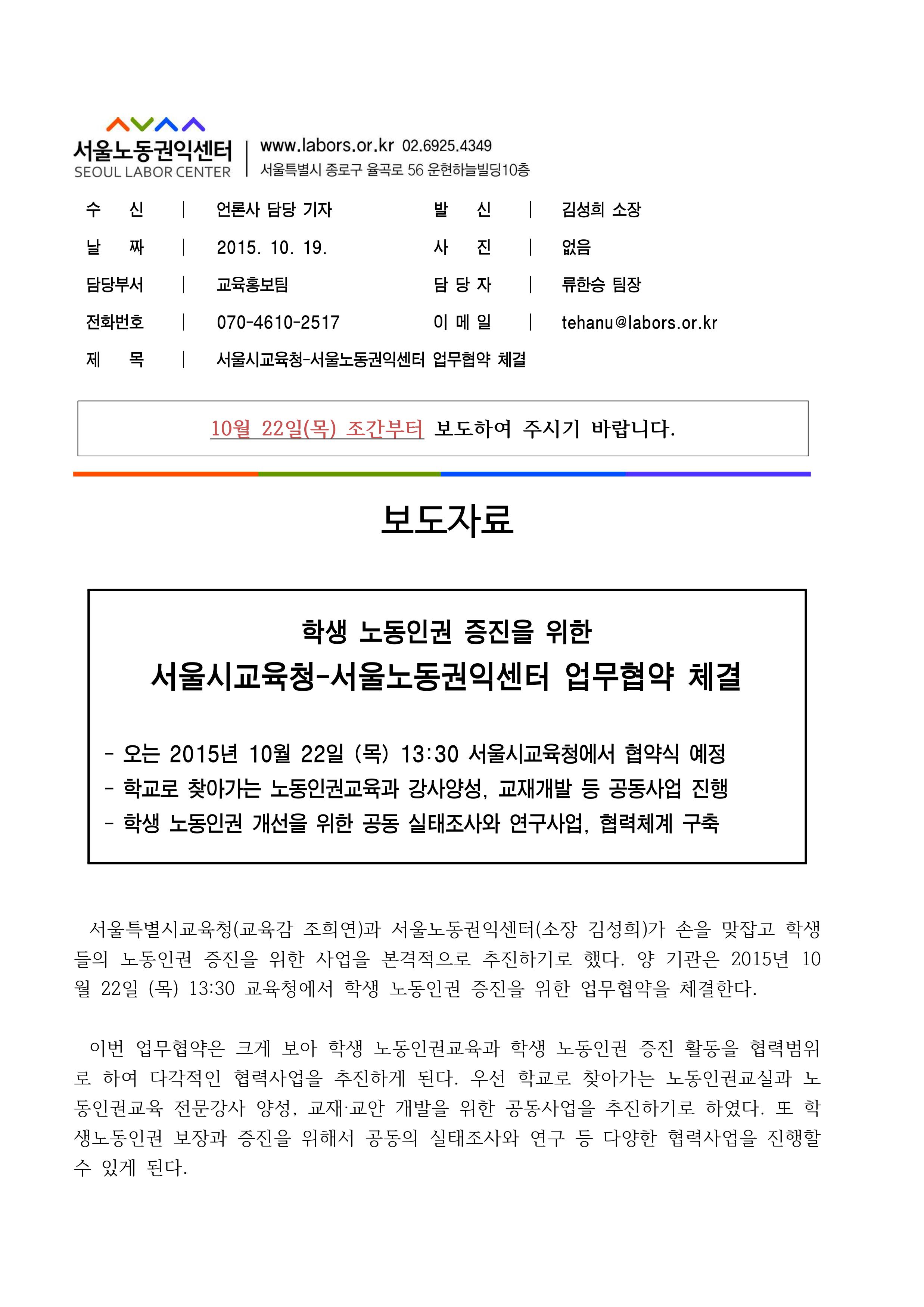 보도자료] 서울시교육청-서울노동권익센터 업무협약 체결_2015-10-19