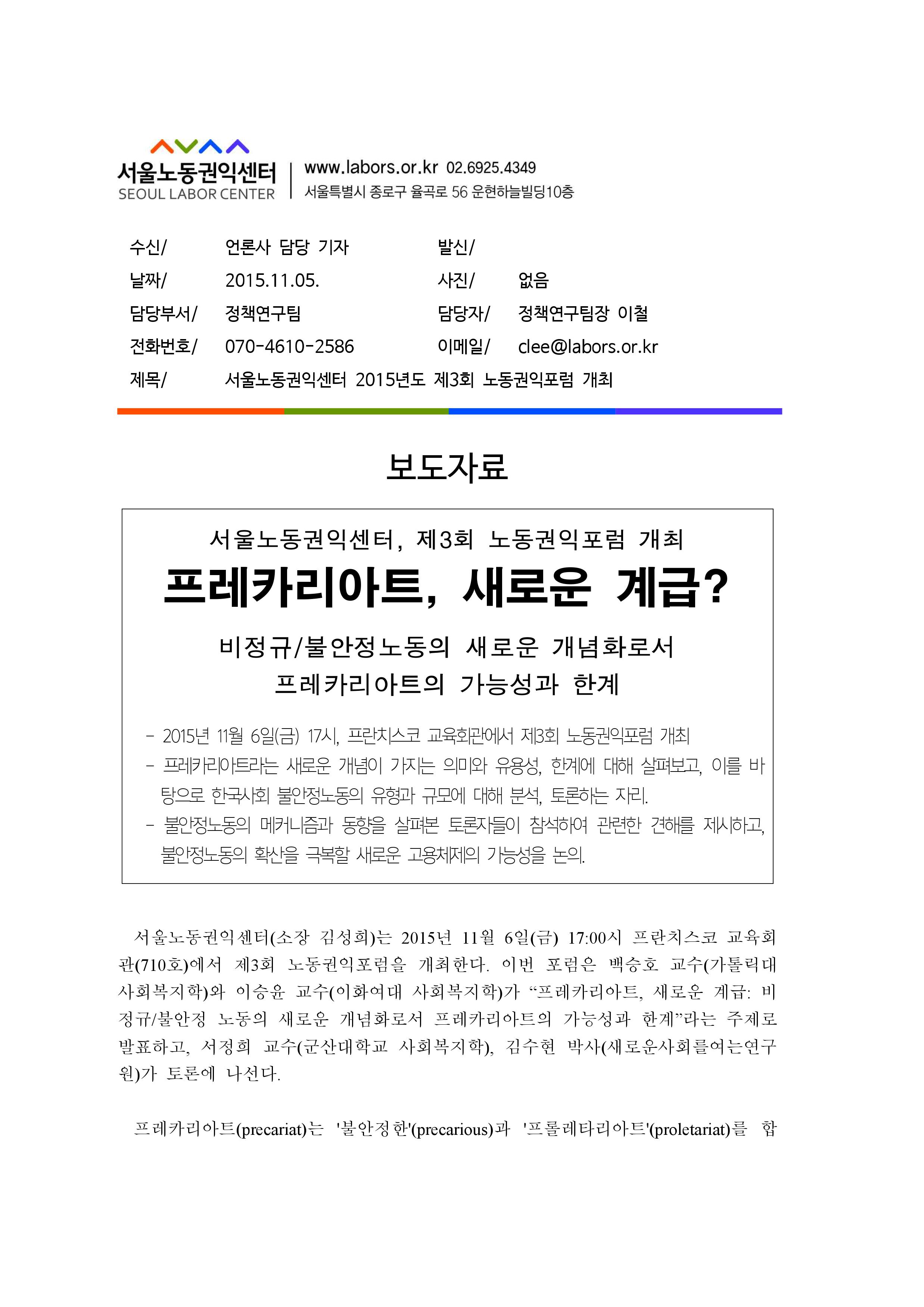 [보도자료] 제3회 노동권익포럼개최_2015-11-09