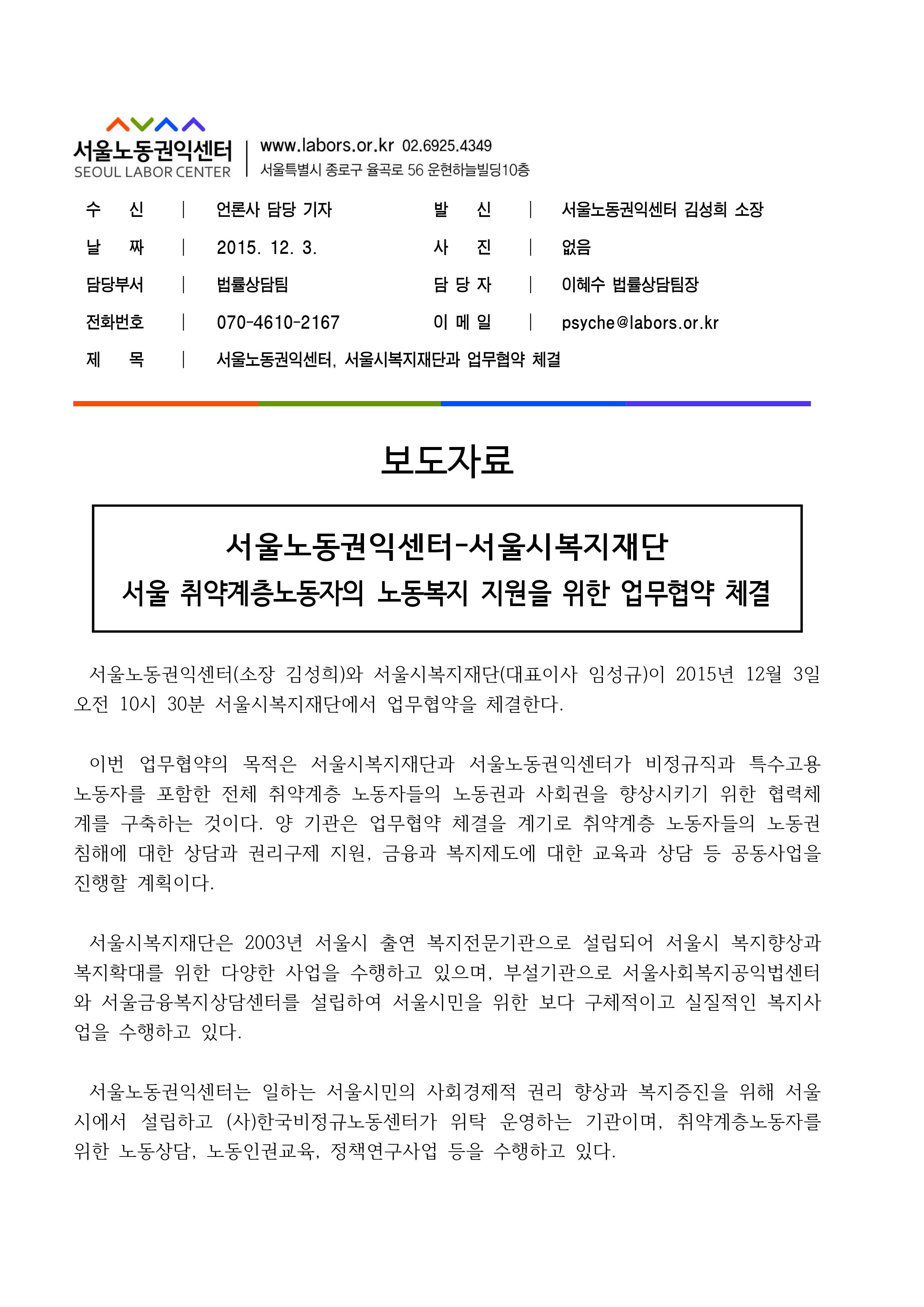 [보도자료] 서울노동권익센터-서울시복지재단 업무협약 체결_2015-12-03