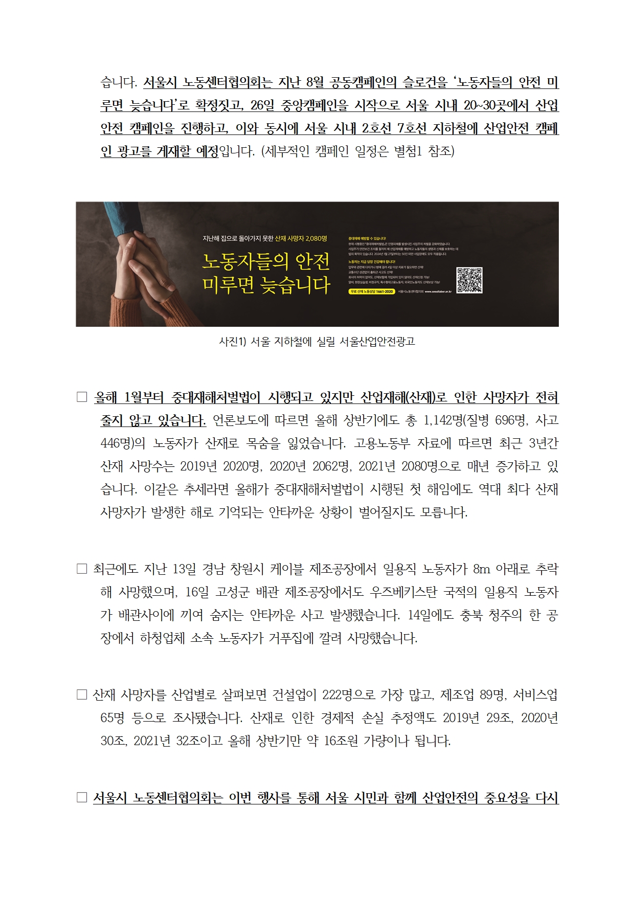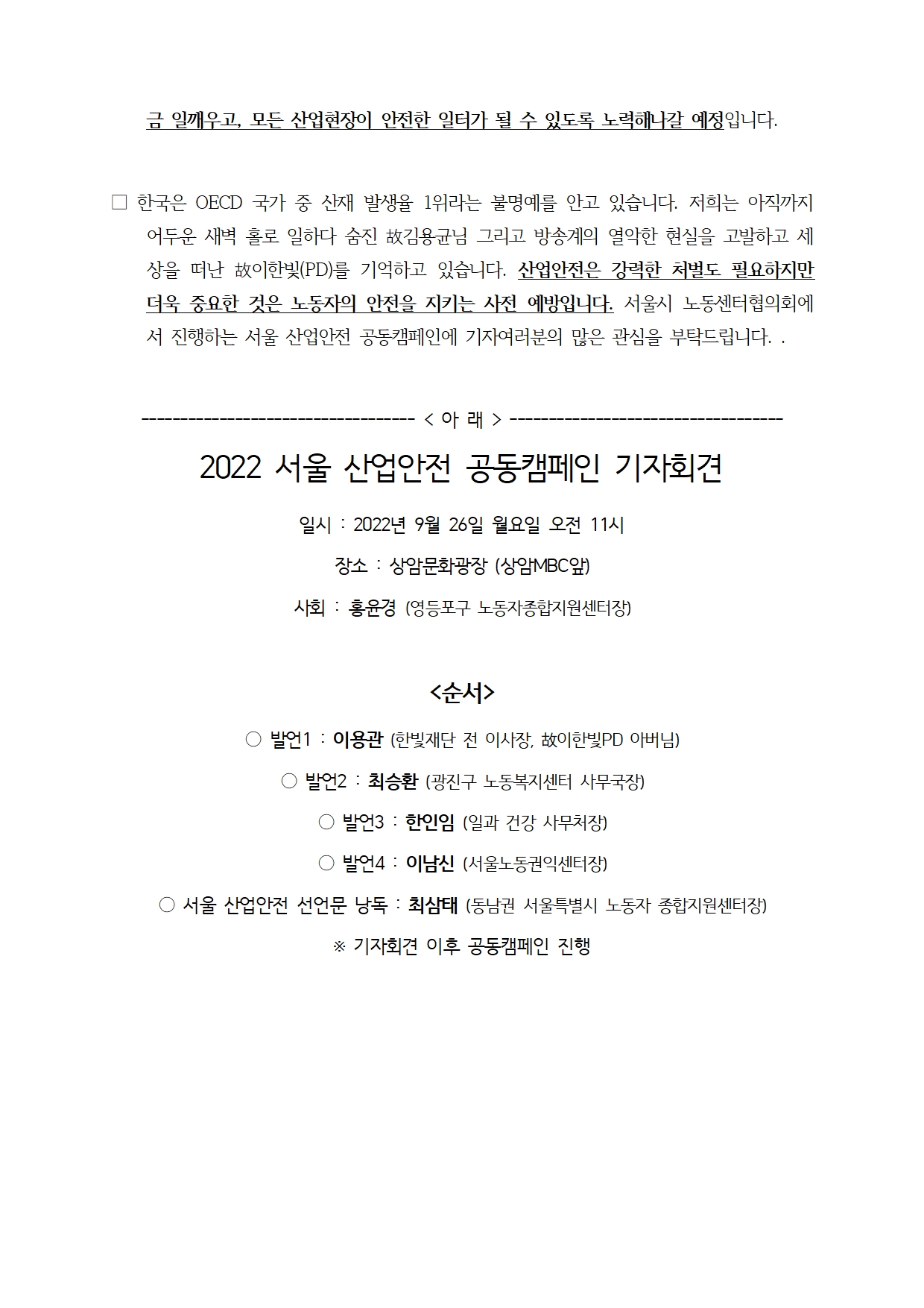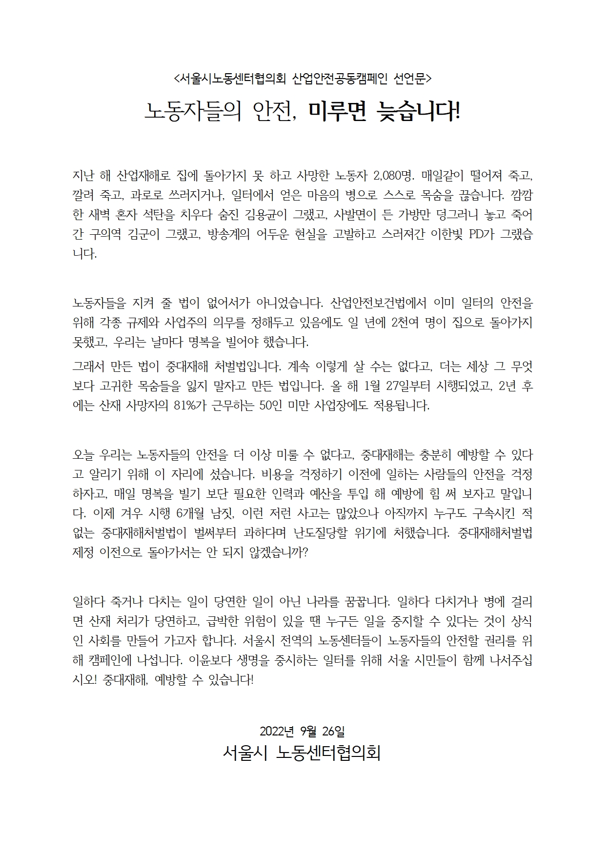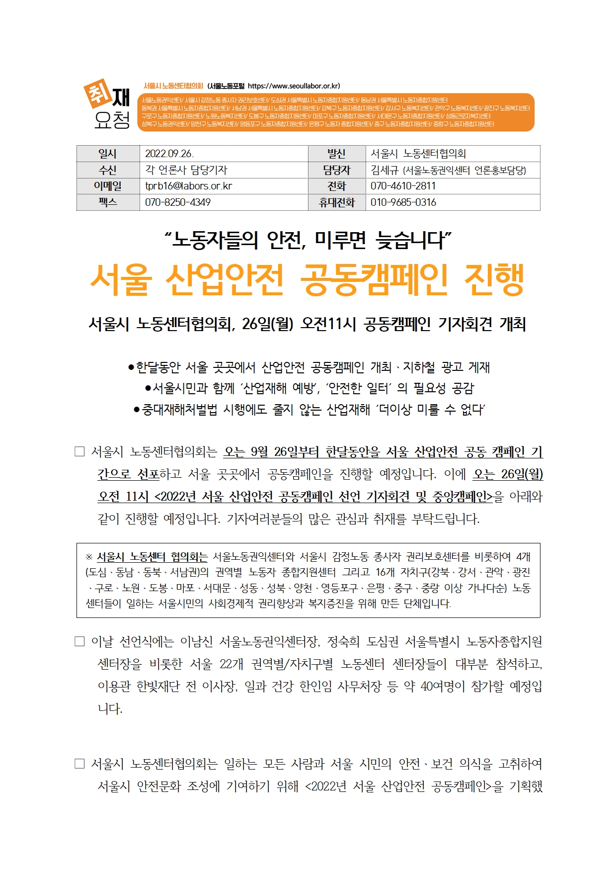 [취재요청_서울시노동센터협의회] 서울 산업안전 공동캠페인 선언식_2022-10-06