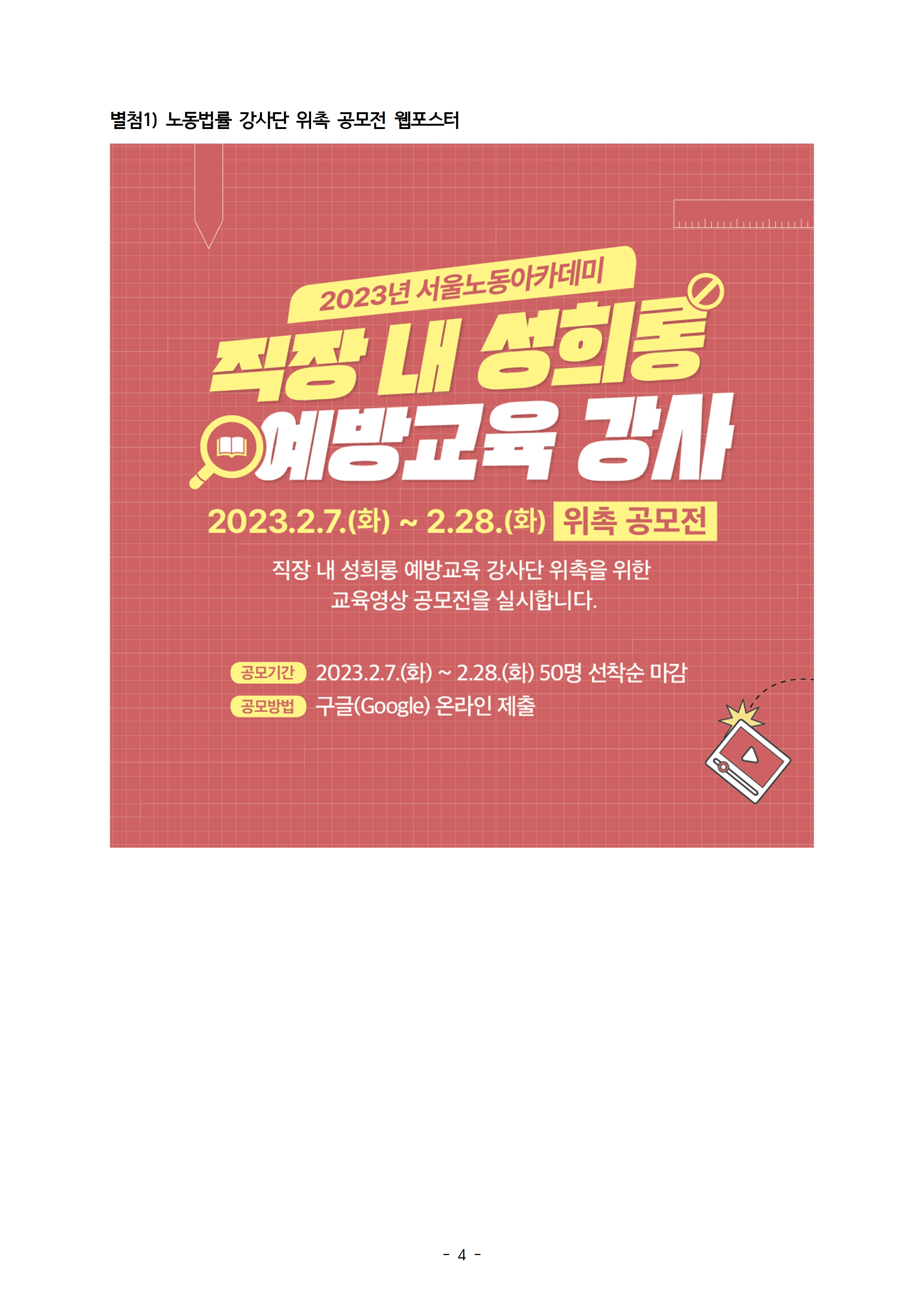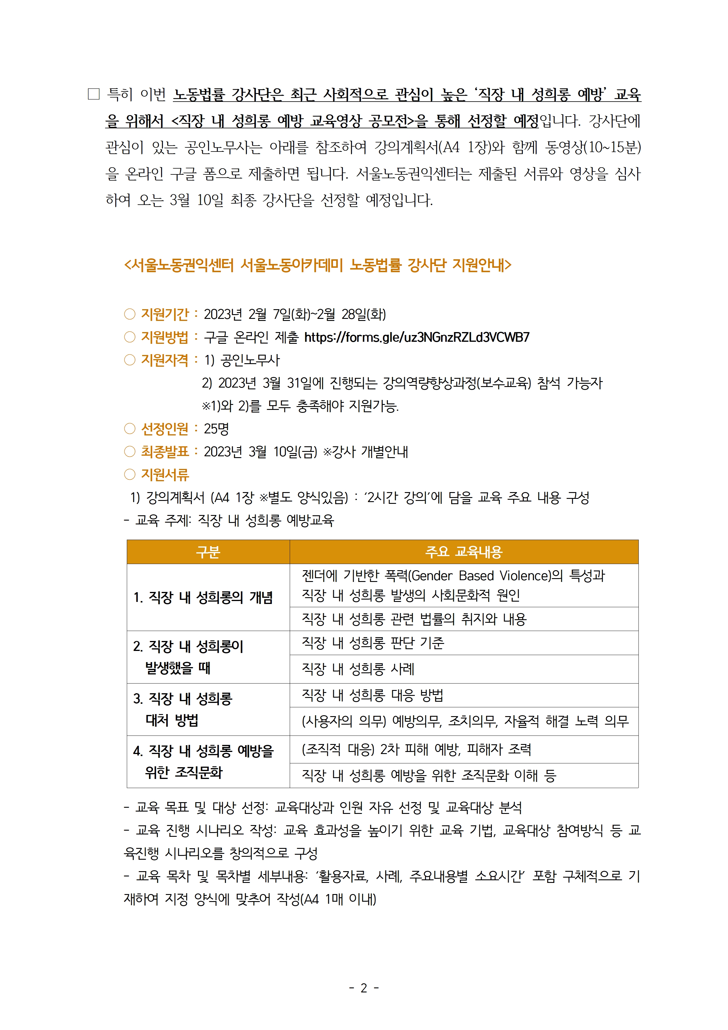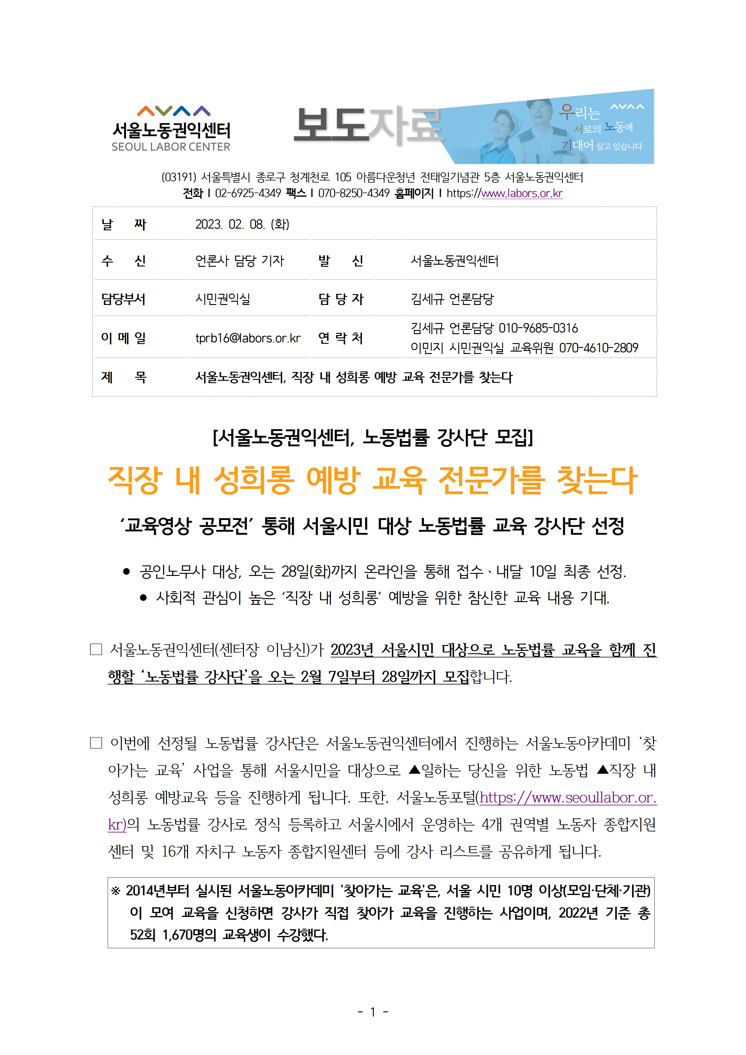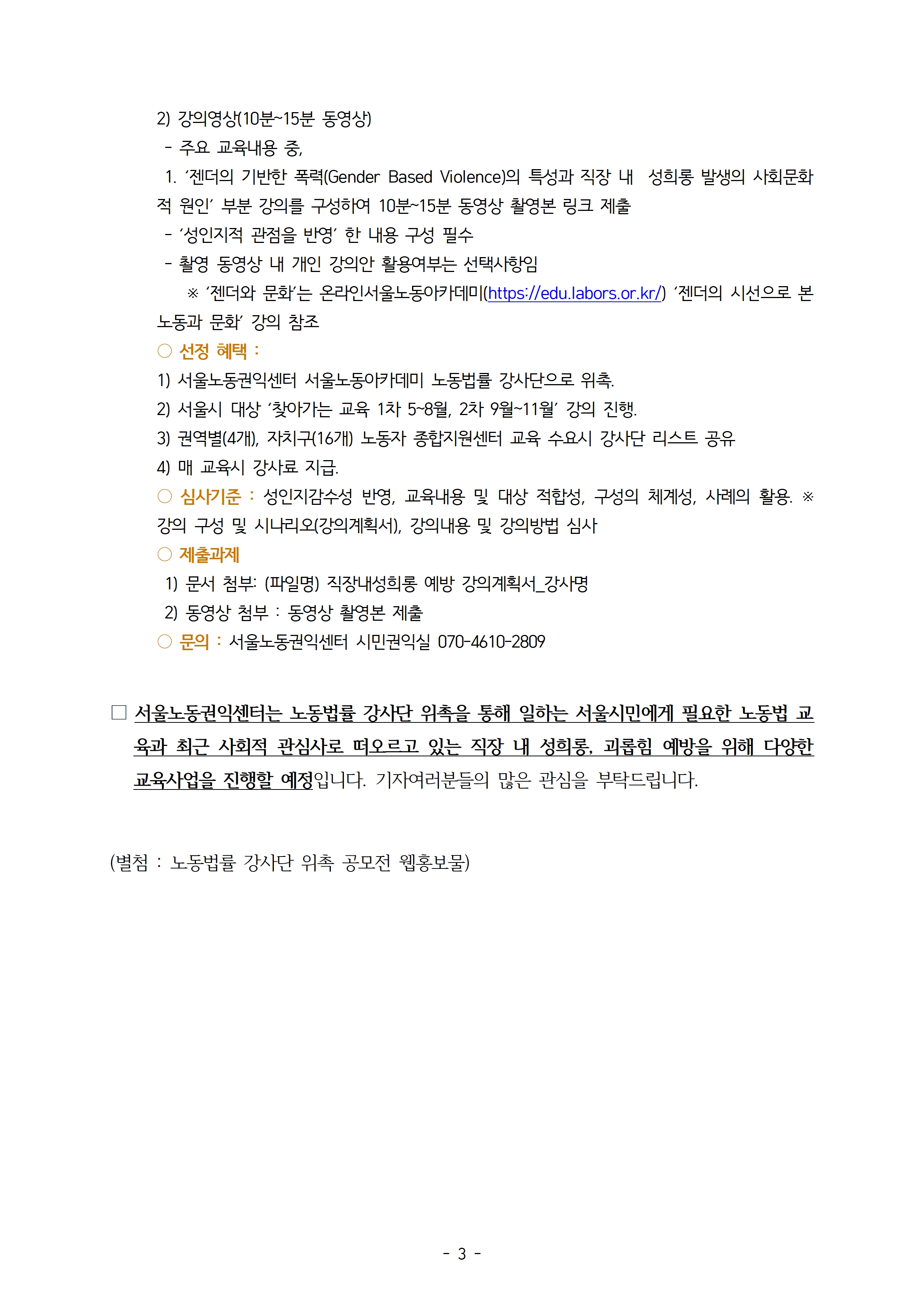 서울노동권익센터, 직장 내 성희롱 교육 전문가 공모