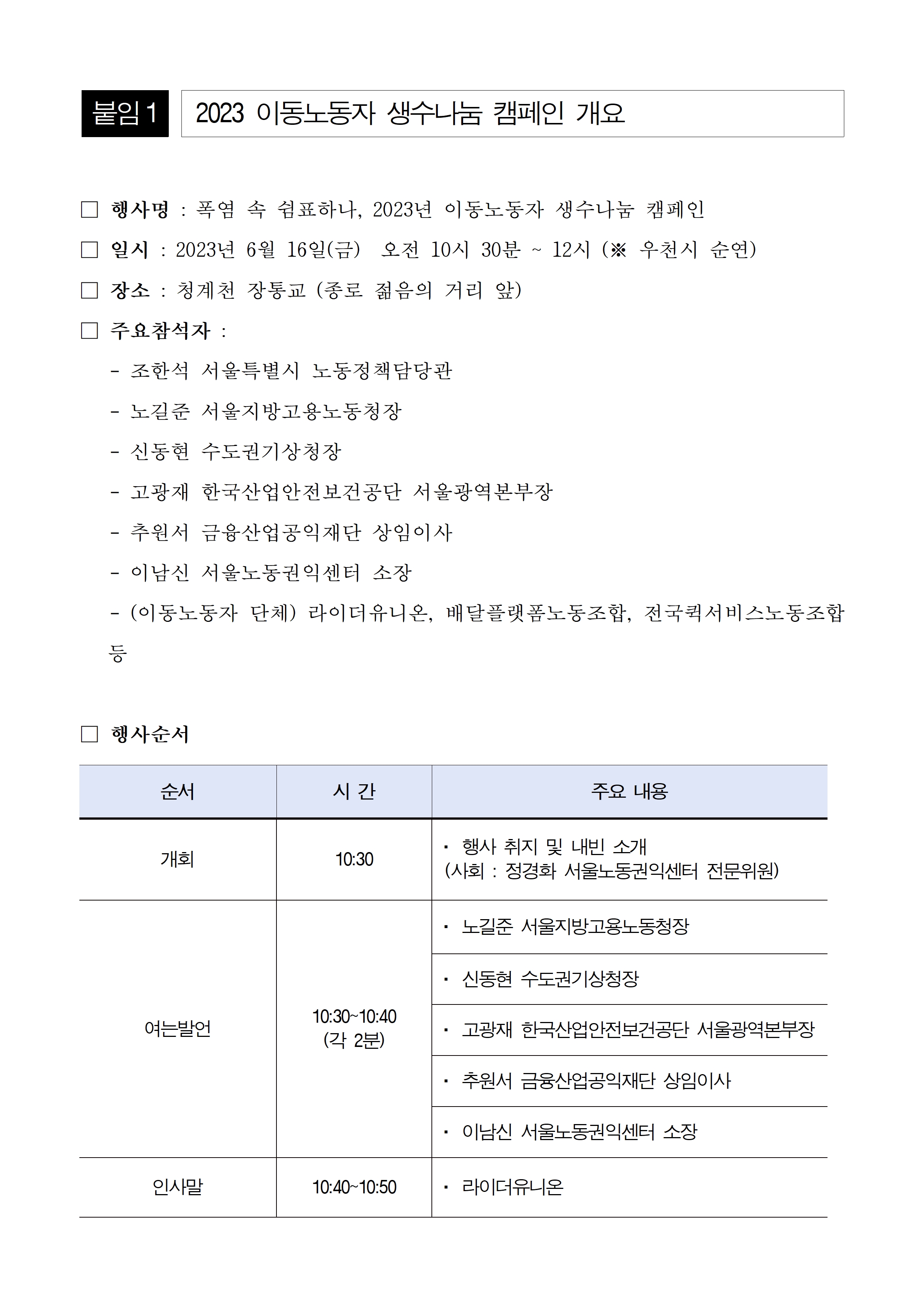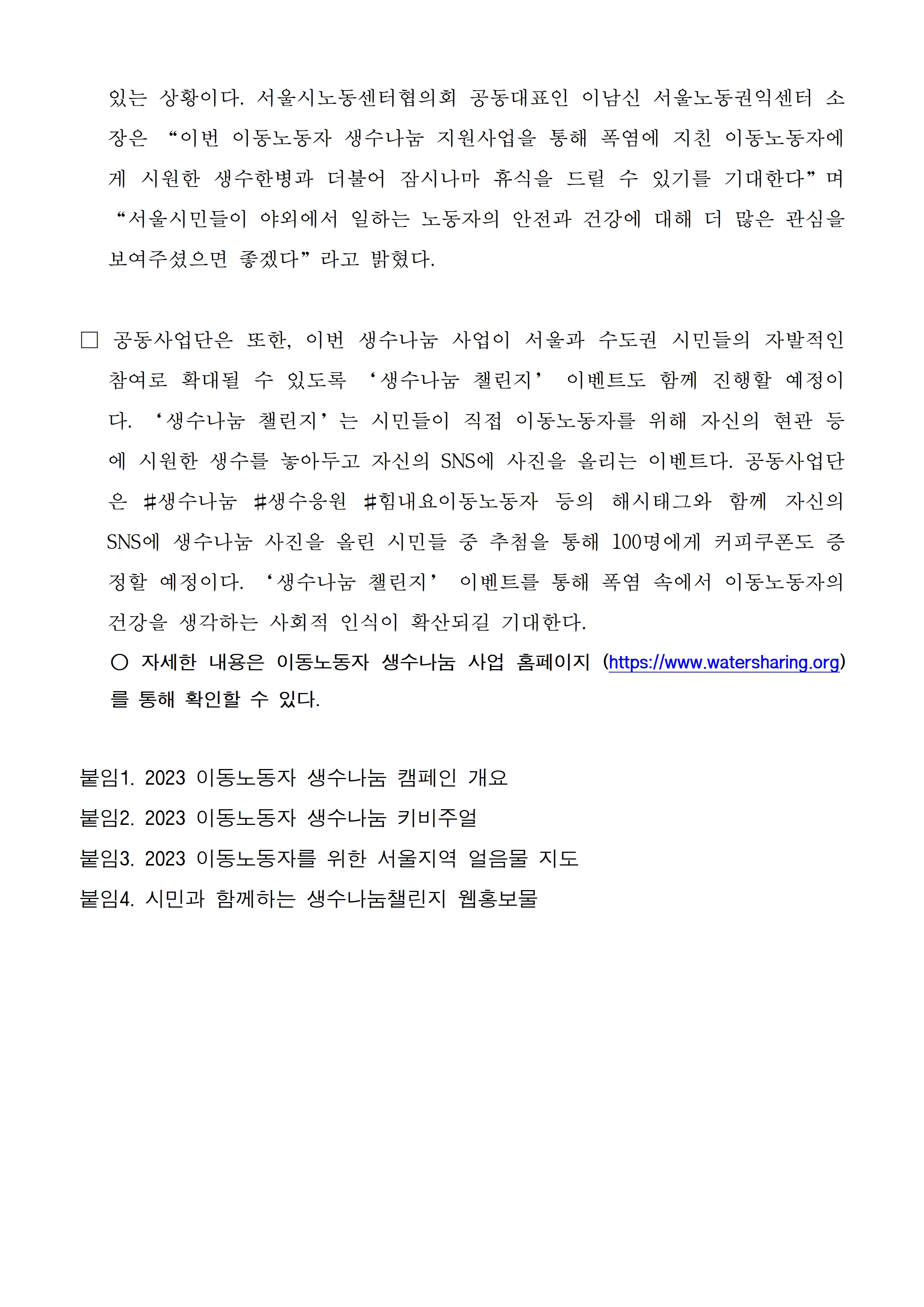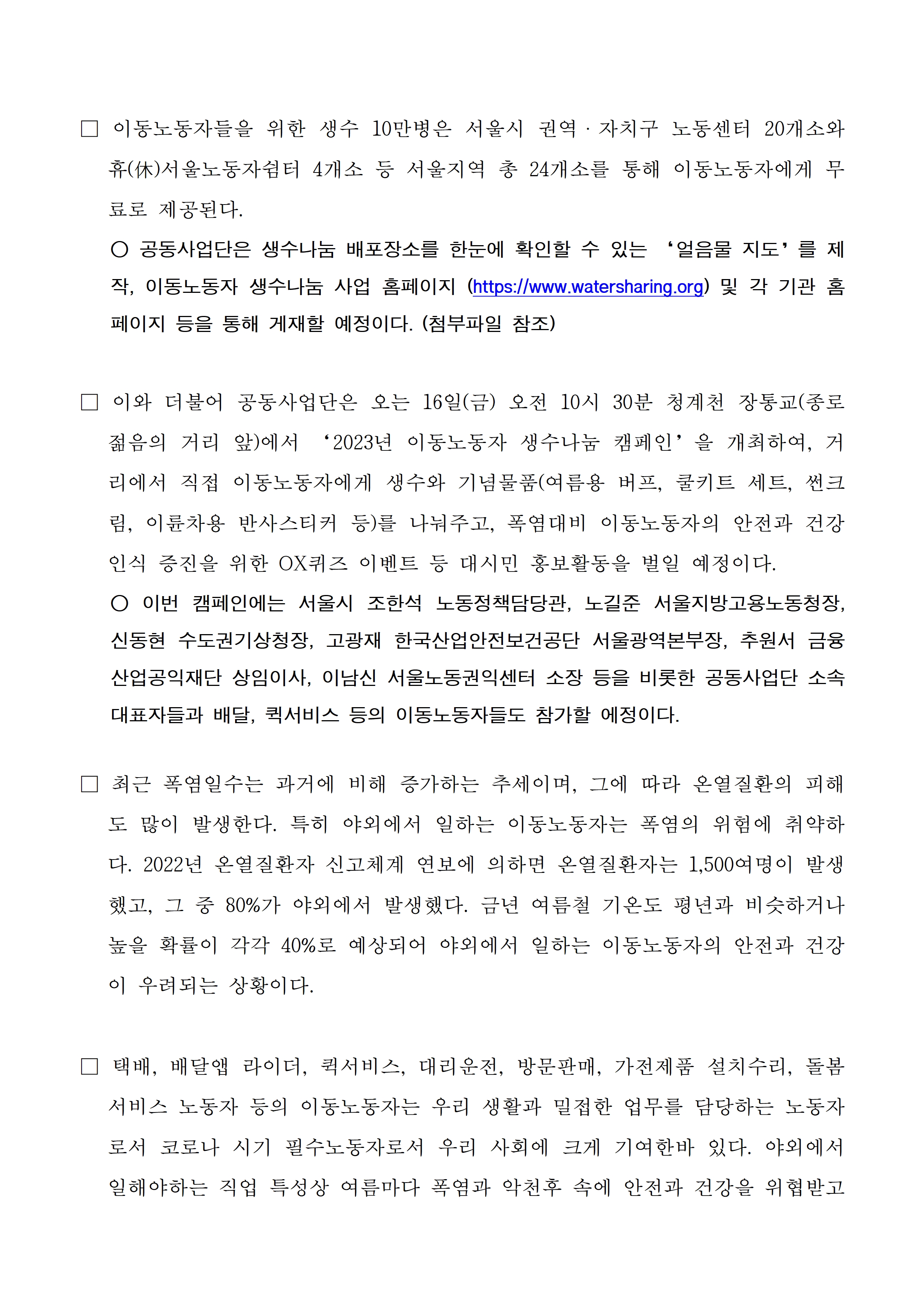 폭염대비 이동노동자 생수나눔 지원사업 진행