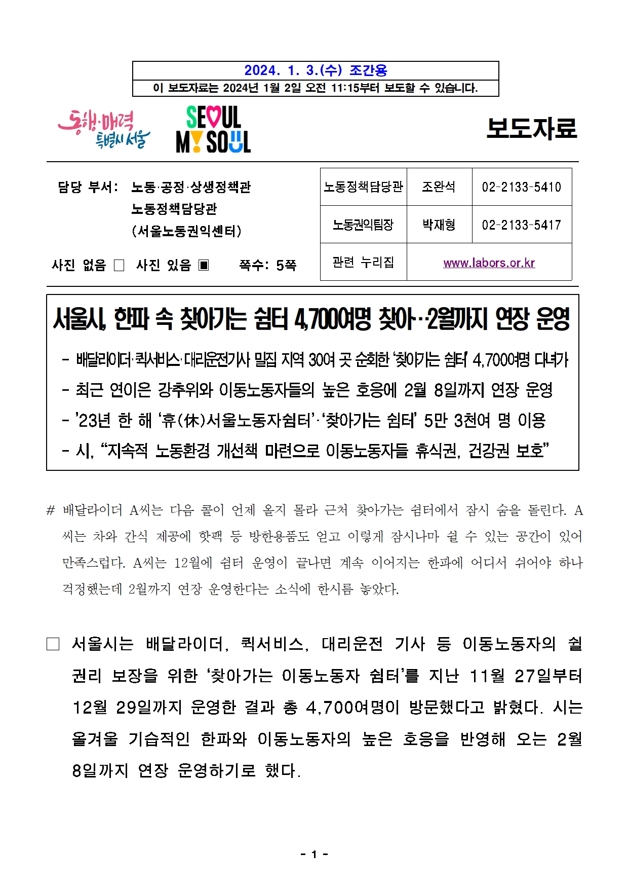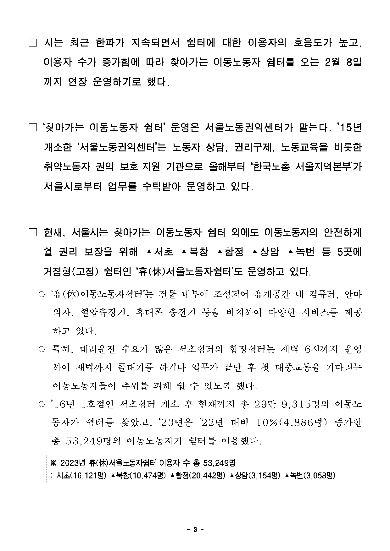 [서울시] 서울시, 한파 속 찾아가는 쉼터 4,700여명 찾아…2월까지 연장 운영