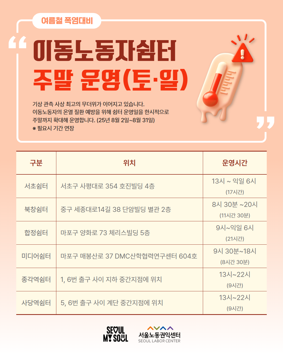서울시는 길어진 폭염으로 주말과 공휴일에 갈 곳이 마땅치 않은 폭염 취약계층을 보호하기 위해 8월 한 달간 무더위 쉼터를 집중 운영한다고 밝혔습니다.