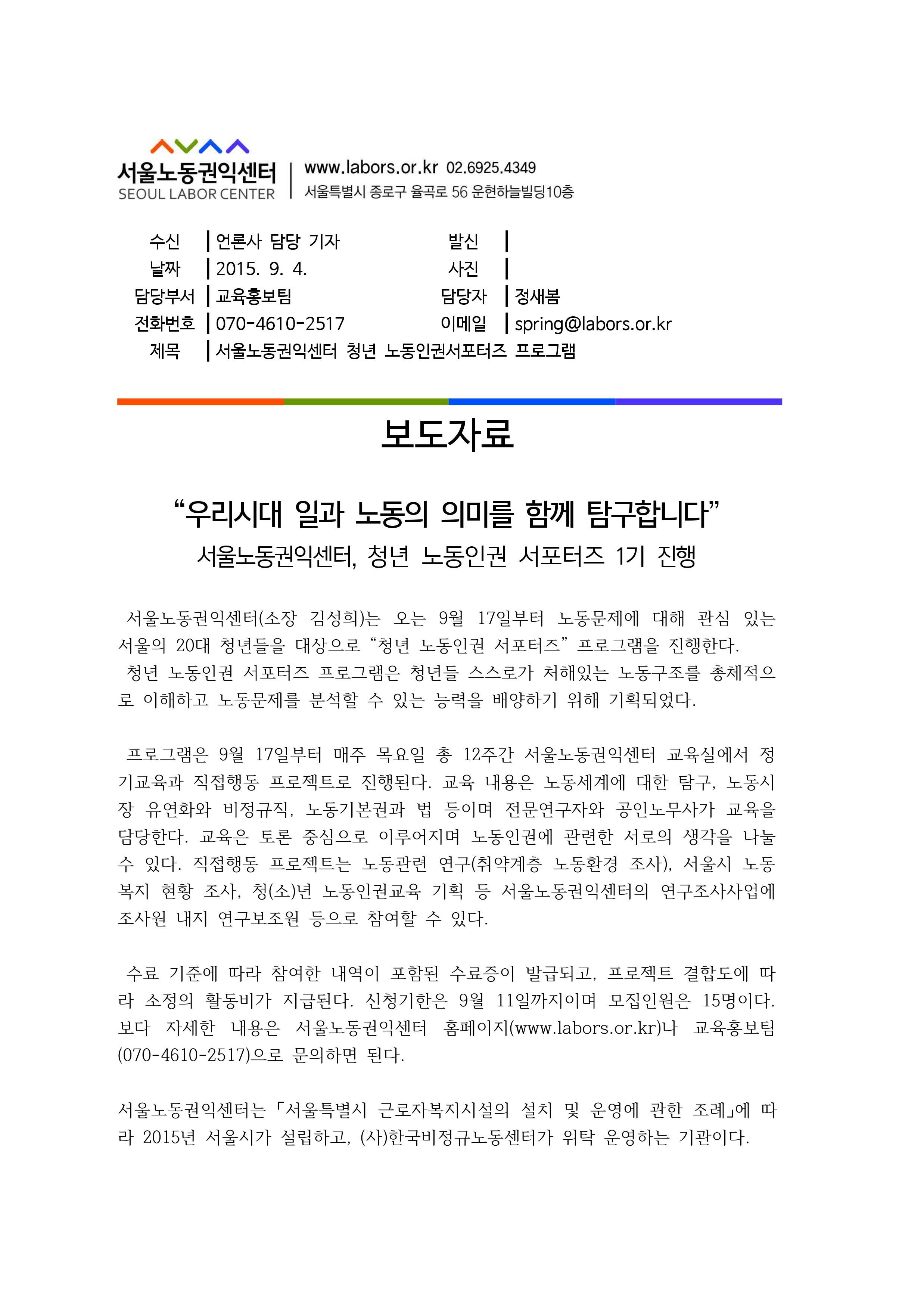 [보도자료] 청년 노동인권 서포터즈 1기 진행_2015-09-04