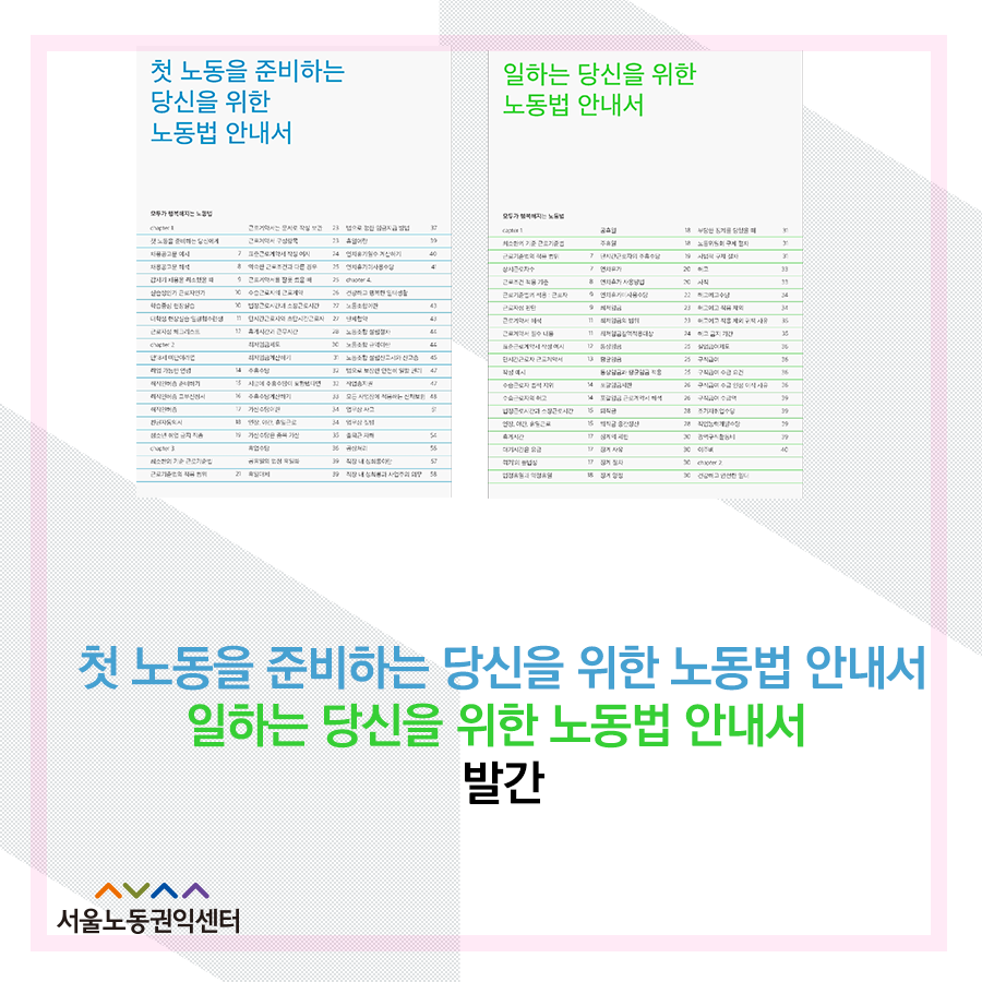 서울노동권익센터에서 기획, 제작한 '첫 노동을 준비하는 당신을 위한 노동법 안내서', '일하는 당신을 위한 노동법 안내서' 2종의 노동법 교재가 발간되었습니다.